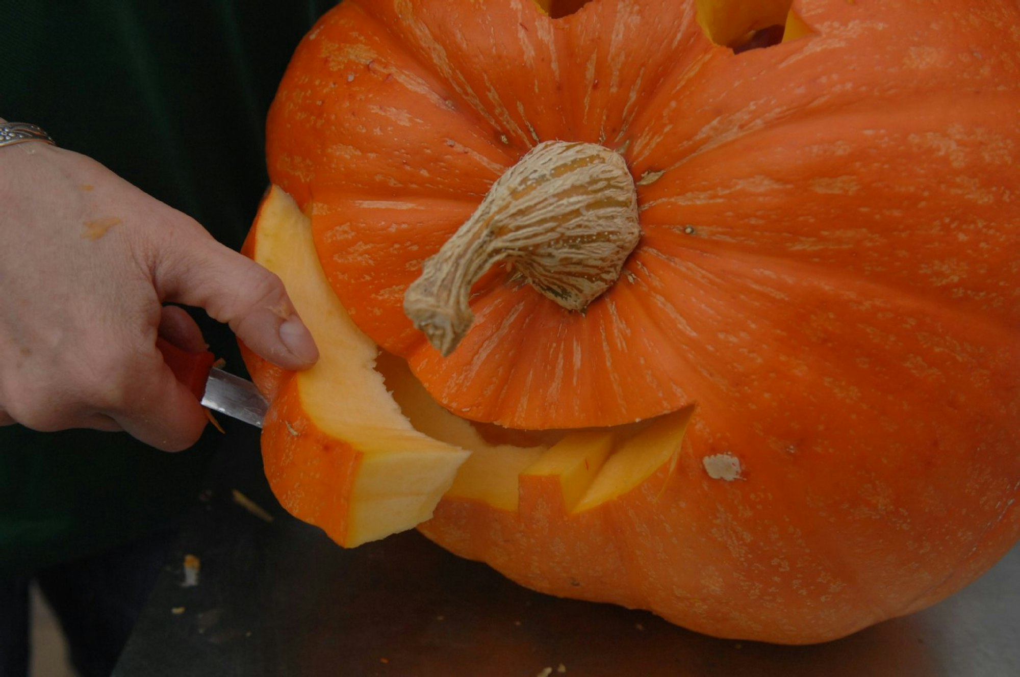 Der Hokkaidokürbis eignet sich nicht nur zum Kochen, sondern auch zum Schnitzen. Wer ihn benutzt, kann aus dem Fruchtfleisch noch Suppe, Püree oder Kuchen zaubern. Als erstes gilt es ein Loch zu machen, um den Kürbis auszuhöhlen. Dazu einen Deckel im Kürbiskopf ausschneiden. Um eine größere Auflagefläche für den Deckel zu erhalten, den Schnitt schräg in Richtung Mitte ansetzen. Alternativ ist es möglich die Unterseite aufzuschneiden, denn so kann das Innere leicht herausgezogen, und bei einer elektronischer Lichtquelle eventuelle Kabel versteckt, werden.