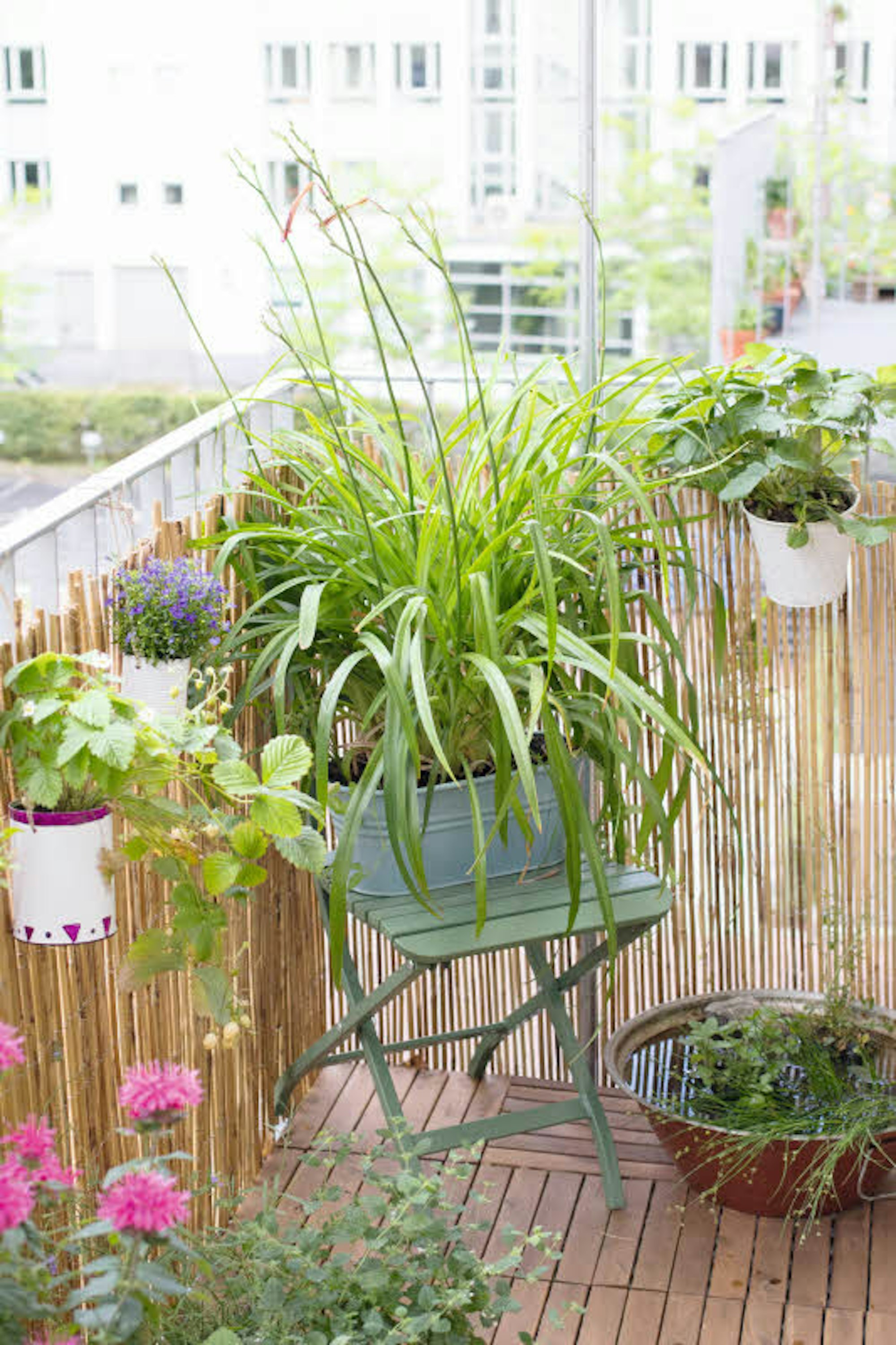 Sonnenhungrige Pflanzen können auf Stühlen oder Tischen platziert werden, bis diese wieder gebraucht werden. Das spart Platz und kann dekorativ aussehen. Hässliches Balkongeländer verschwindet hinter Schilfrohrmatten, an die Töpfe gehängt werden.