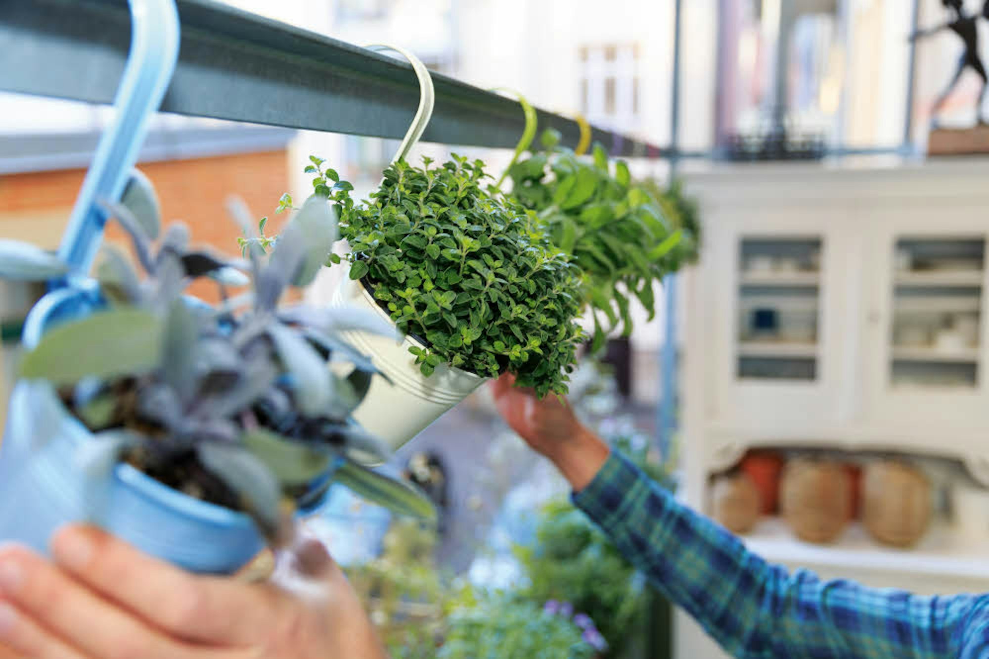 Manche Balkons haben Stangen und Streben. Nutzen Sie so etwas, um Töpfe aufzuhängen. Manche kommen schon mit Henkel und haben eine praktische Größe für Kräutertöpfe. Dann können auch mehrere Töpfe ineinander gehängt werden und einen Sichtschutz bilden, empfiehlt Experte Folko Kullmann. Wenn Töpfe unter freiem Himmel hängen, muss regelmäßig Regenwasser ausgegossen werden.