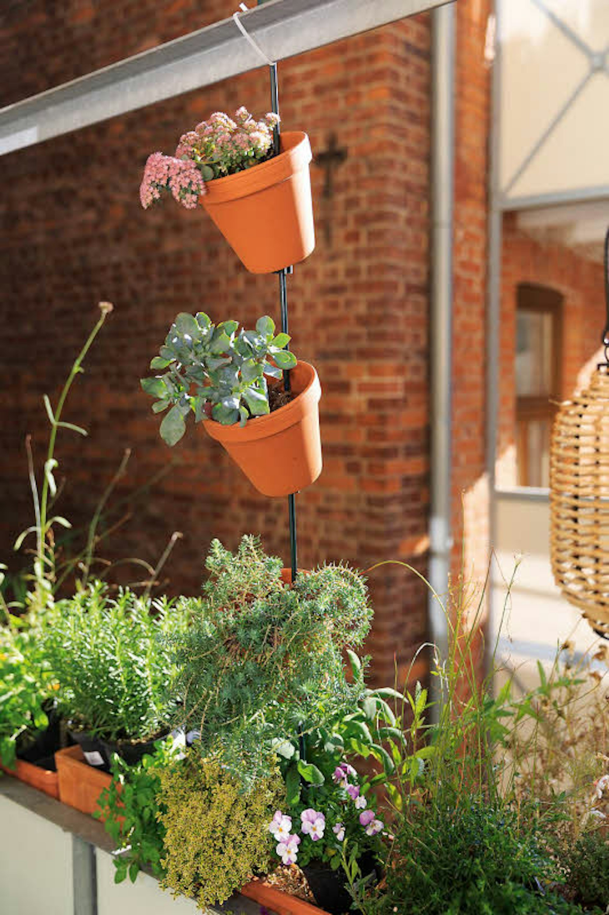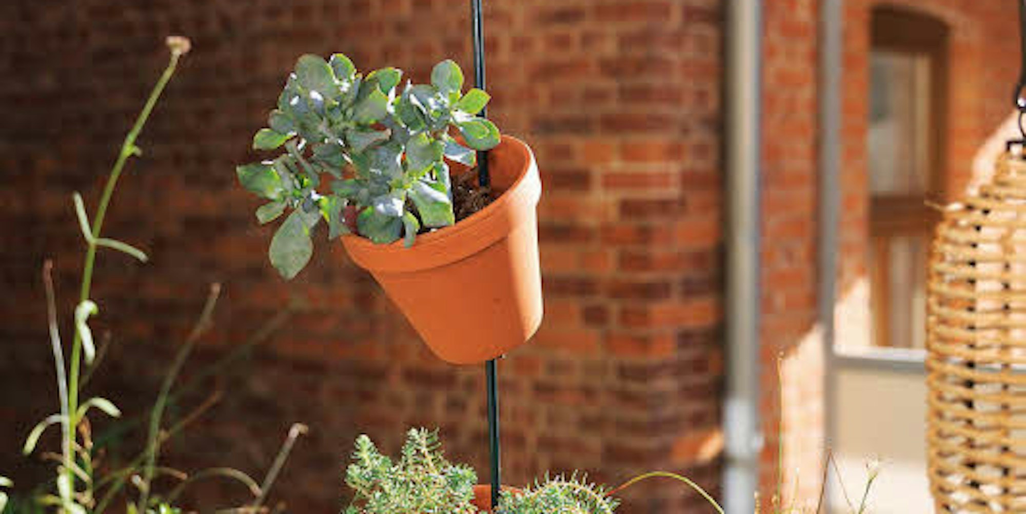 Eine Blumenampel ganz unkitschig: Nutzen Sie Höhe aus und befestigen Sie tönerne Töpfe an einer vertikalen Stange. Hinein kommen langsam wachsende Pflanzen, die bestenfalls Trockenheit vertragen – kleine Fetthennen etwa, wie hier in Folko Kullmanns Beispiel.