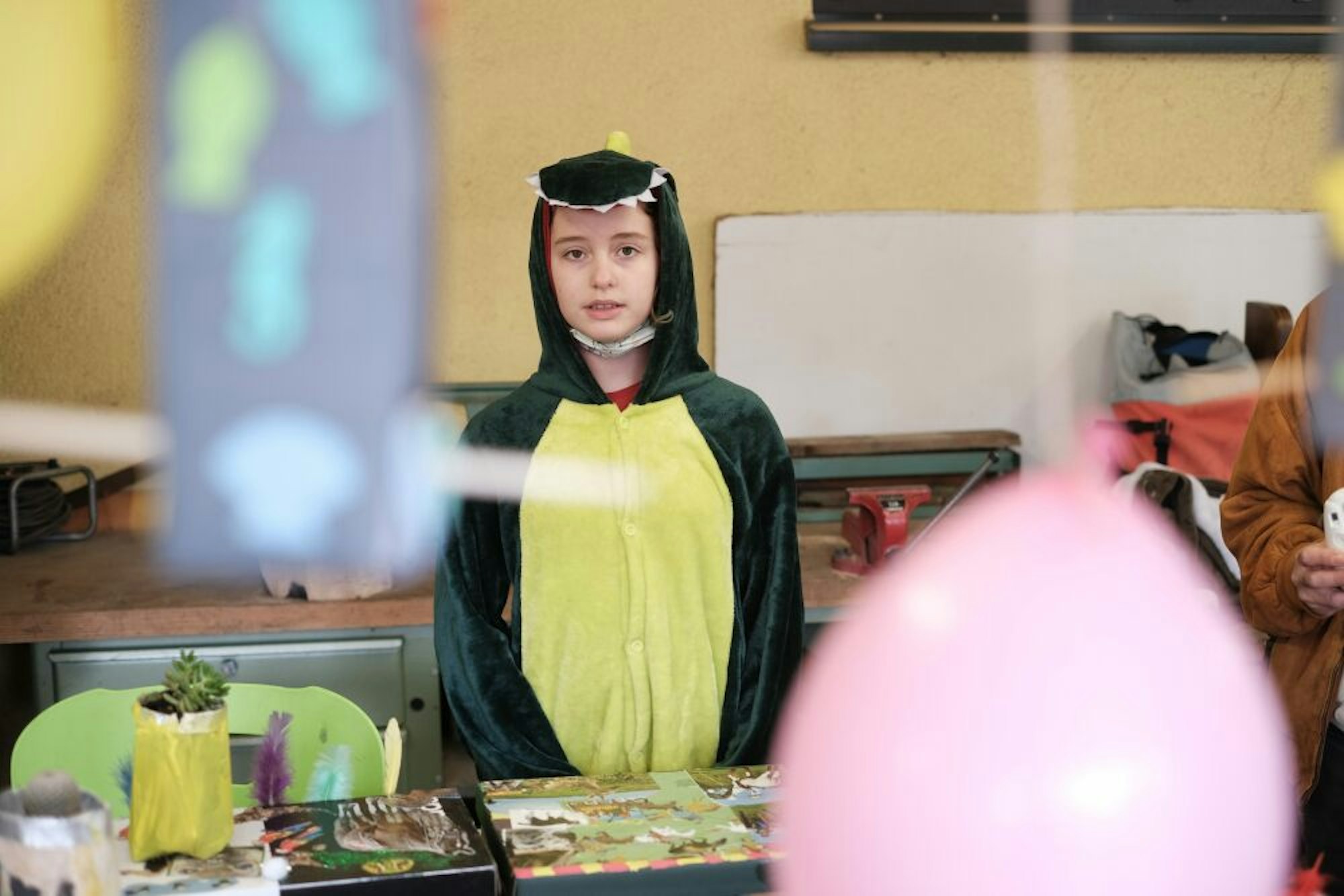 Und es hat ihnen gefallen, erzählt die zehnjährige Linn beim Abschluss des Projektes „Aus Müll mach mehr“ auf dem Bauspielplatz in Seeberg. Außerdem präsentiert das Mädchen im grünen Dinosaurier-Kostüm, welche Kunst sie und die anderen selbst geschaffen haben: ovale Bienenhäuser aus Holz, bunt beklebte Blumentöpfe aus leeren Milchkartons, Schlüsselanhänger und Schmuck aus kaputten Fahrradschläuchen.