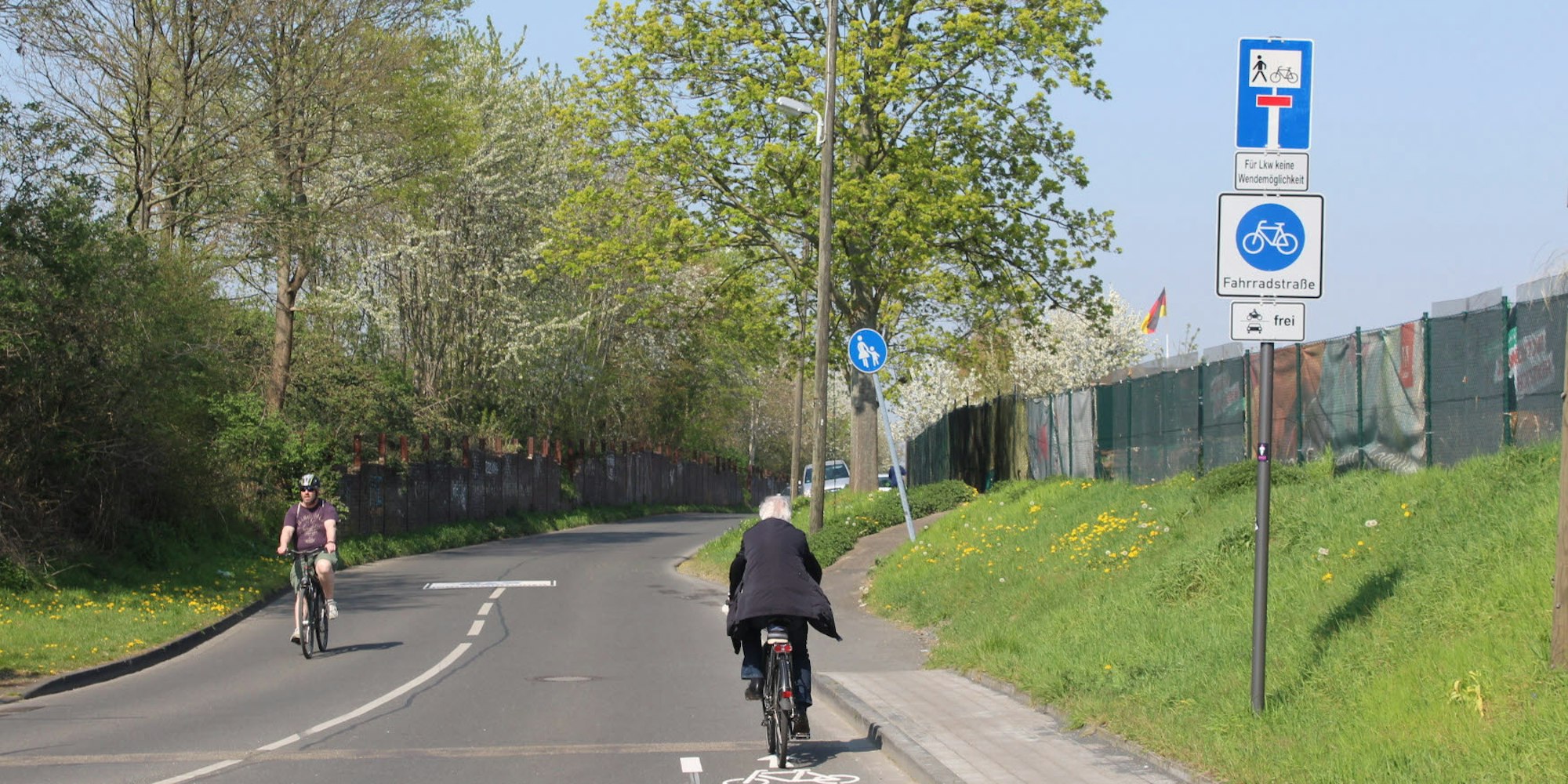 Bereits seit mehr als einem Jahr ist die Etzelstraße, die Longerich und Weidenpesch verbindet, auf den 300 Metern zwischen dem neuen Kreisel Longericher Straße/Ossietzkystraße und Auf dem Ginsterberg eine Einbahnstraße. Auf dem restlichen Kilometer bis zur Bahndamm-Unterführung in Richtung Bilderstöckchen gilt seit April eine Fahrradstraße. Motorisierte Verkehrsteilnehmer dürfen sie zwar weiterhin nutzen, haben sich jedoch dem Radverkehr anzupassen und müssen ihr Tempo drosseln. Mehrere große Schilder in beiden Fahrtrichtungen fassen die wichtigsten Regeln zusammen: Maximal Tempo 30, genügend Abstand beim Überholen von Rädern, Nebeneinander-Radeln ist erlaubt. Ein wichtiger Grund für die Einrichtung der Fahrradstraße ist die Carl-von-Ossietzky-Gesamtschule, die seit Herbst 2019 ihr neues Gebäude bezogen hat, direkt am nördlichen Ende der Etzelstraße. Viele Schüler aus Nippes, Mauenheim oder Bilderstöckchen nutzen die Fahrradstraße für ihren Weg.