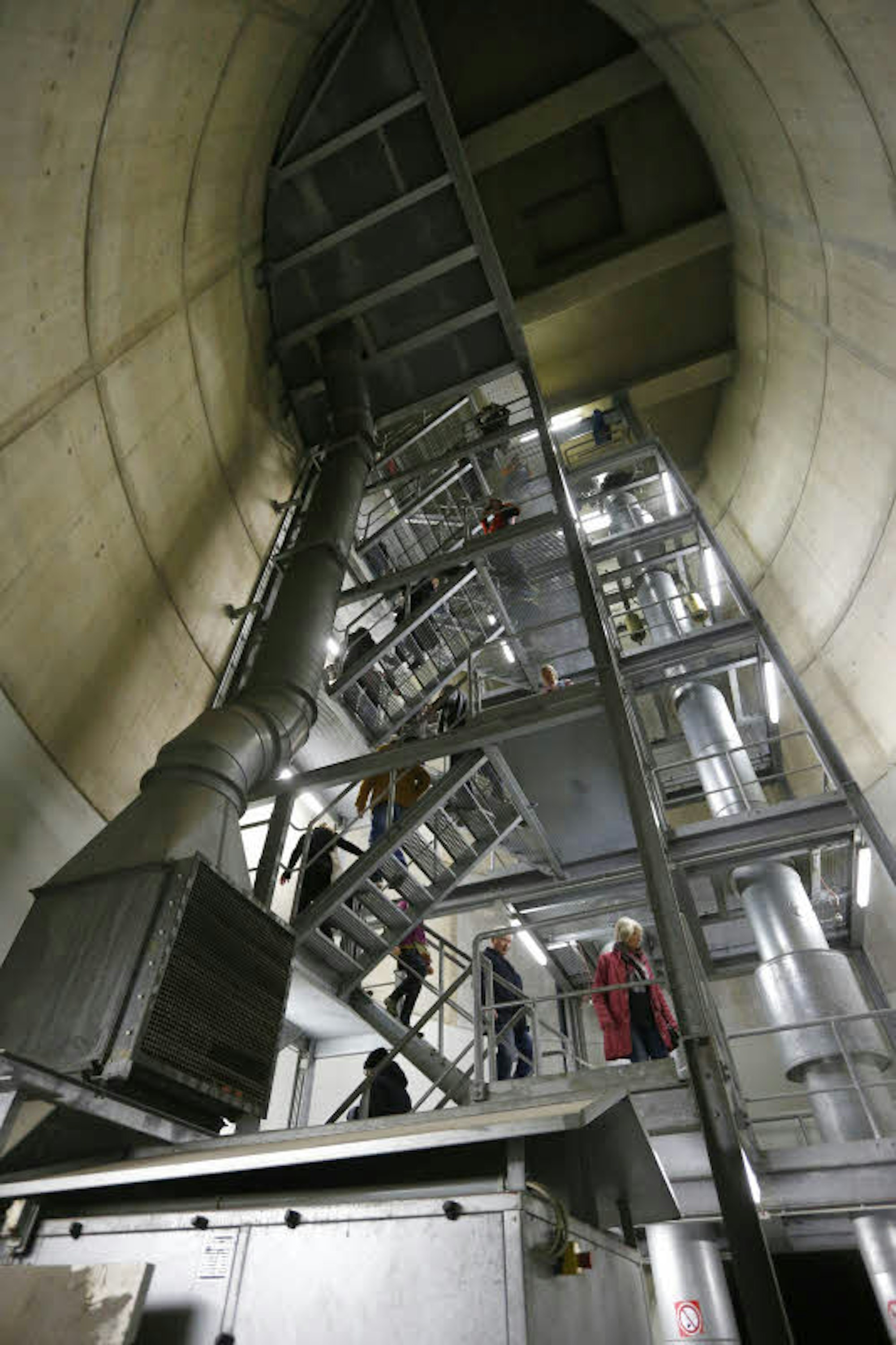 Unscheinbar ist das Betontürmchen, das in die Anlage hinabführt, hinter der viel Ingenieurskunst steckt. Etwa 100 Stufen geht es für die 30 Besucher nach unten. Schwindelfrei sollte man sein, denn die Gitterroste geben den Blick bis ganz nach unten frei. Auf der ersten Zwischenetage stehen dicke Stromkästen. Unten angekommen fühlt es sich an wie in einer Rakete oder Forschungsstation. In einer Box aus gelbem Gitter liegen Steinbrocken, die bei der Tunnelbohrung zum Vorschein kamen. Weiter hinten liegen noch größere Felsen und ein Stück Stahlträger der Hohenzollernbrücke von vor dem Zweiten Weltkrieg.