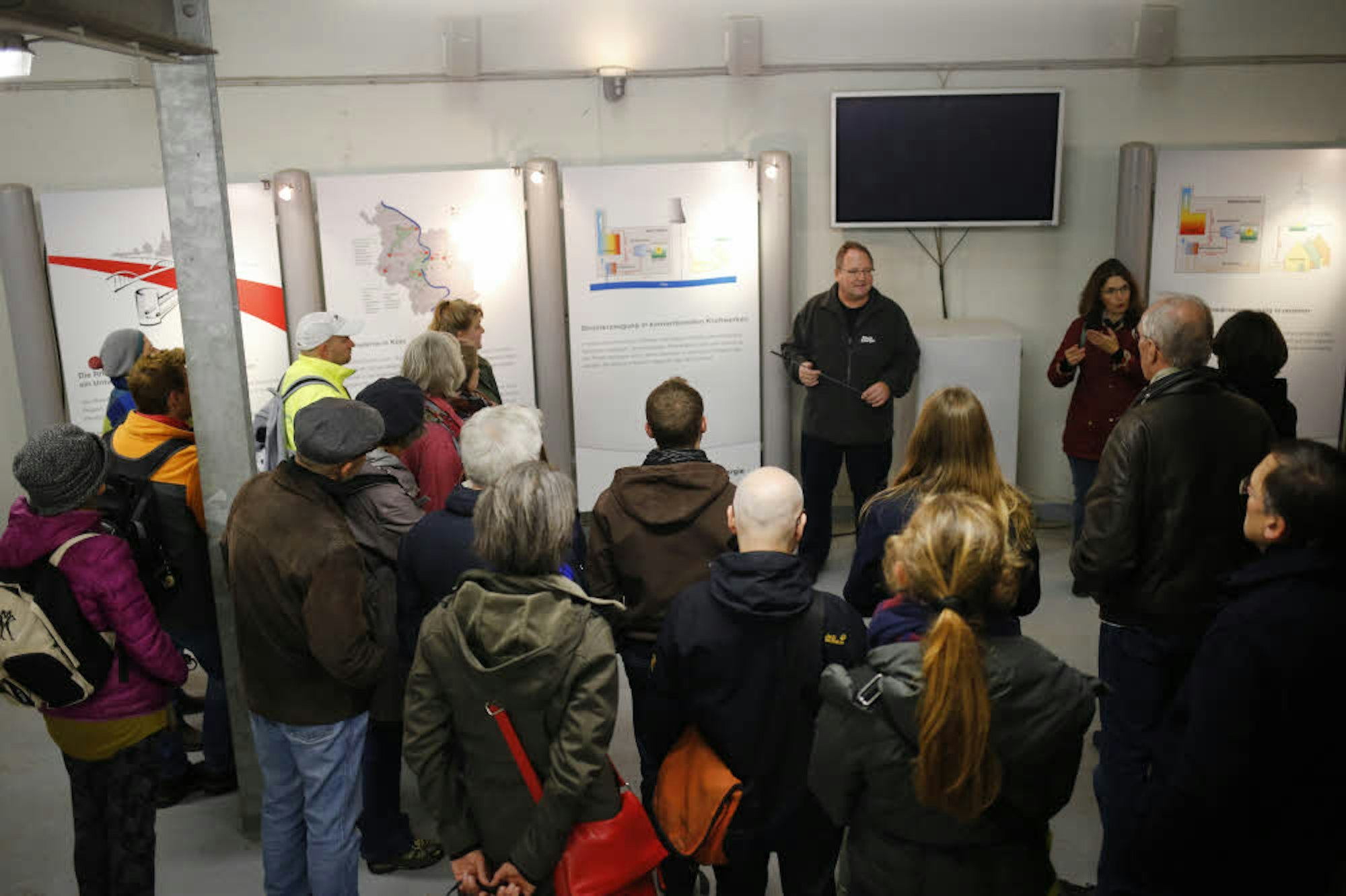 Knapp zwei Jahre dauerte es, bis der Tunnel 1985 fertig war. Damals war es das erste Mal weltweit, dass ein Tunnel mit der Rohrvortriebtechnik gebaut wurde – also die Tunnelelemente von Pressen mit einem Bohrer voran durch das Erdreich gedrückt wurden. Vor acht Schautafeln erklärt Frank Straube von der Rhein-Energie, wie die Röhre funktioniert. „Man kann den Tunnel auch Kölns größte Zentralheizung nennen“, sagt er.