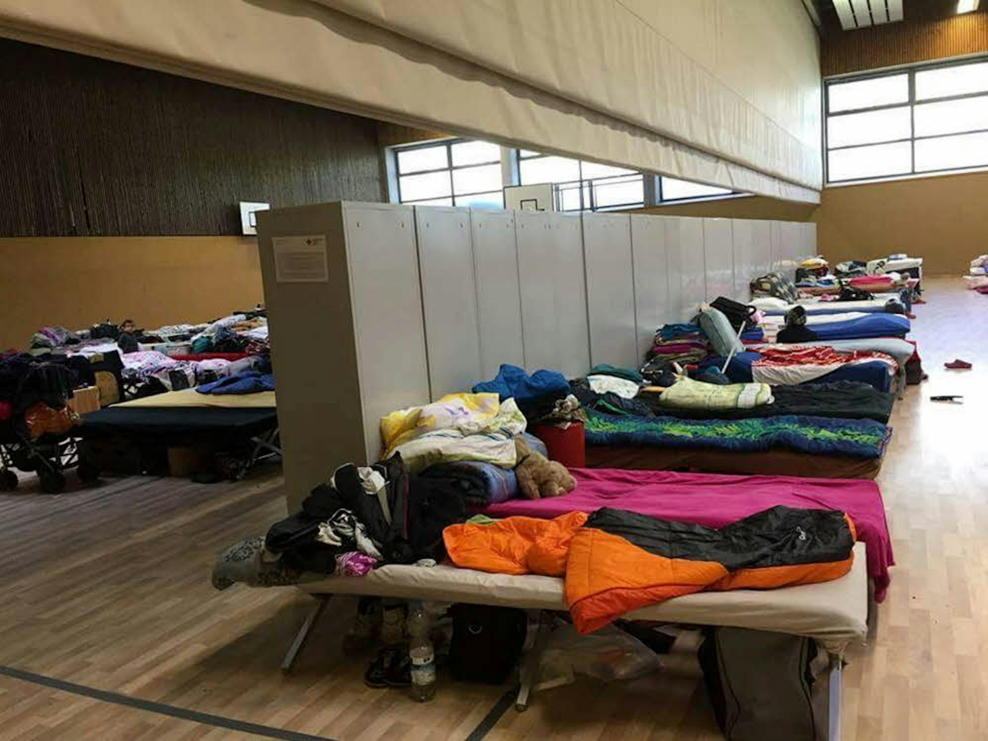 Blick in eine zur Flüchtlingsunterkunft umfunktionierte Turnhalle.