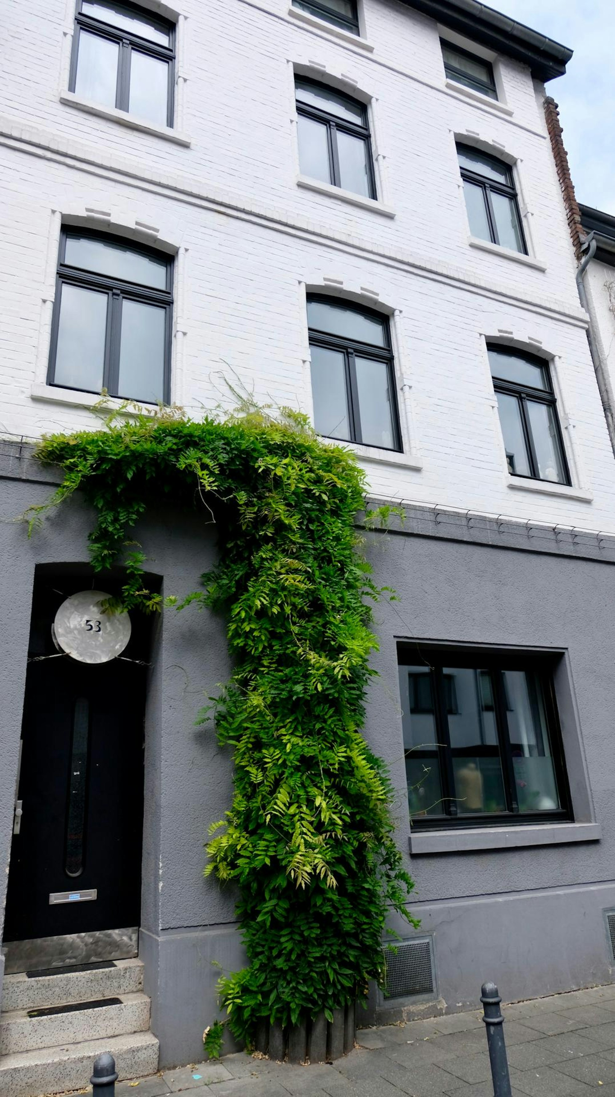 An der Marsiliusstraße 53 wachsen Blauregen und Knöterich. „Das sind schon ältere Pflanzen, die wieder zurückgeschnitten wurden“, so Arentz. Dadurch ist die Rankhilfe direkt auf der Fassade sichtbar, ein gutes Beispiel für eine professionelle Lösung. „Wichtig ist, dass die Pflanzen am Anfang gut gegossen werden und gut anwachsen. Dann entwickeln sich die Wurzeln von selbst ins Erdreich und nehmen Grundwasser auf.“ Wo es keinen Vorgarten gibt, können in Absprache mit der Stadt – wenn möglich – Platten aus dem Gehweg entfernt werden, damit die Gärtner Zugang zum Erdreich finden.