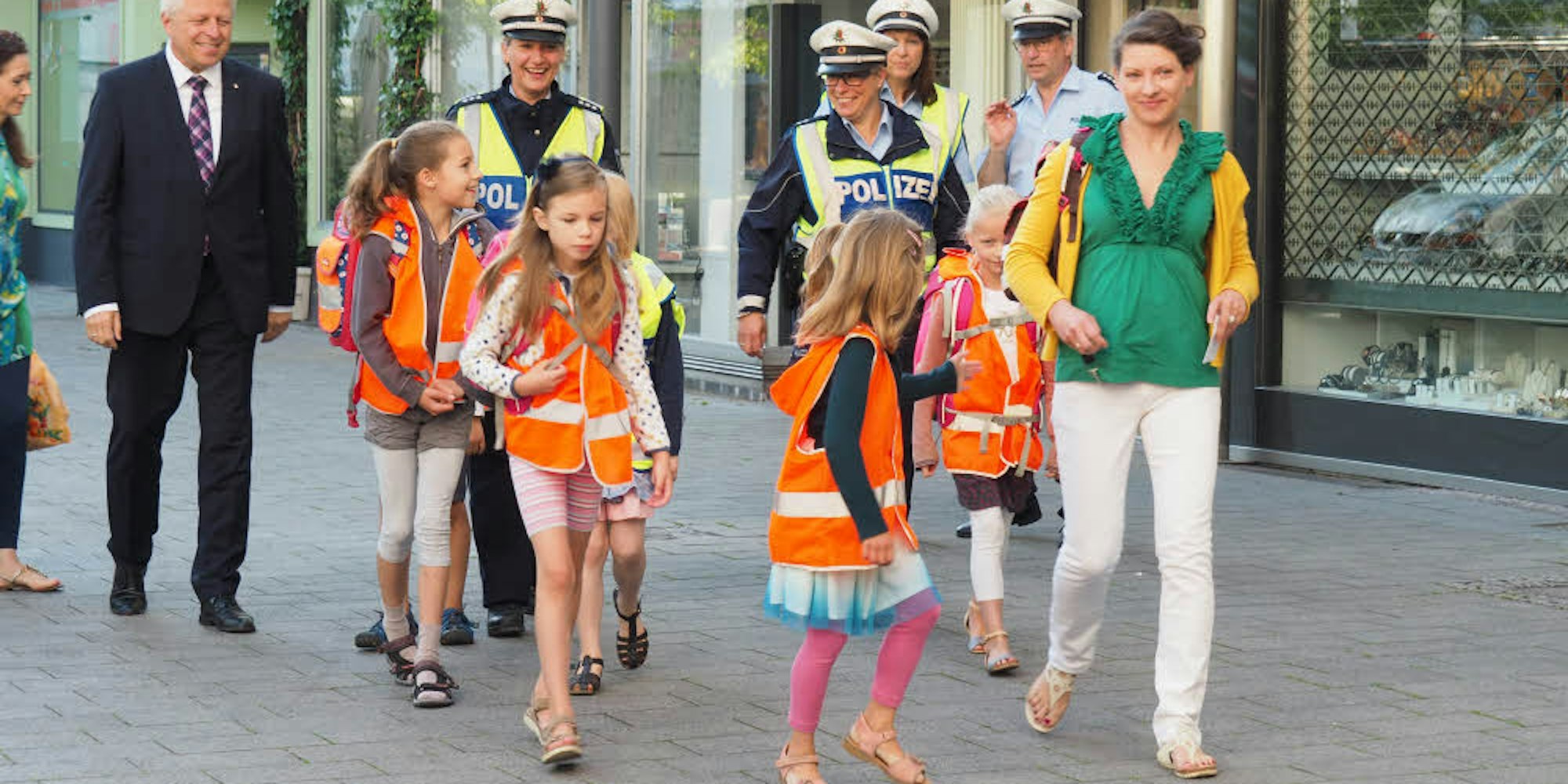 Polizeipräsident Jürgen Mathies begleitete den Walking Bus samt „Fahrerin“ Anne Ludewig (r.)