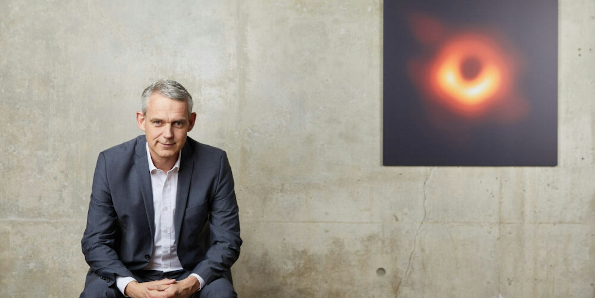 Der in Frechen lebende Astronom Heino Falcke vor dem Bild eines Schwarzen Lochs, das 2019 für eine Weltsensation sorgte.