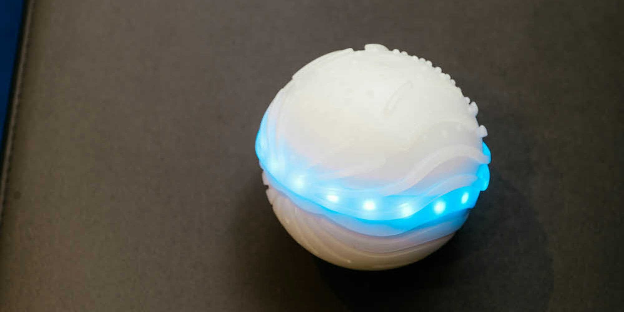 Die Therapiekugel ist ein Allrounder. Wie einen kleinen Ball hält man sie in den Händen. Wenn man sie schüttelt, dreht, wirft, streichelt, dann leuchtet sie, blinkt, reagiert und bietet Anwendungen, für die sie entsprechend den individuellen Bedürfnissen programmiert wurde. Eine Kugel deshalb, „weil ich gesehen habe, dass meine demente Oma das Spiel mit dem Ball noch lange bewältigen konnte. Warum also, so überlegten wir uns, nicht ein Ball mit digitaler Technologie, der in der Therapie eingesetzt werden kann“, so Preuß.