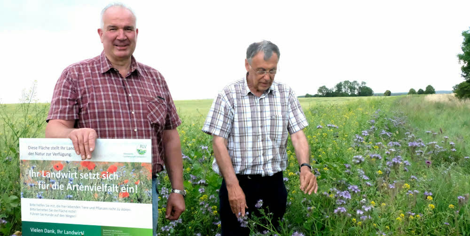 Gelbe und blaue Blumen sollen Wildbienen Nahrung bieten: Ortslandwirt Willi Frisch (l.) und Kreislandwirt Hans Schorn in einem Blühstreifen am östlichen Ortsrand von Dom-Esch.