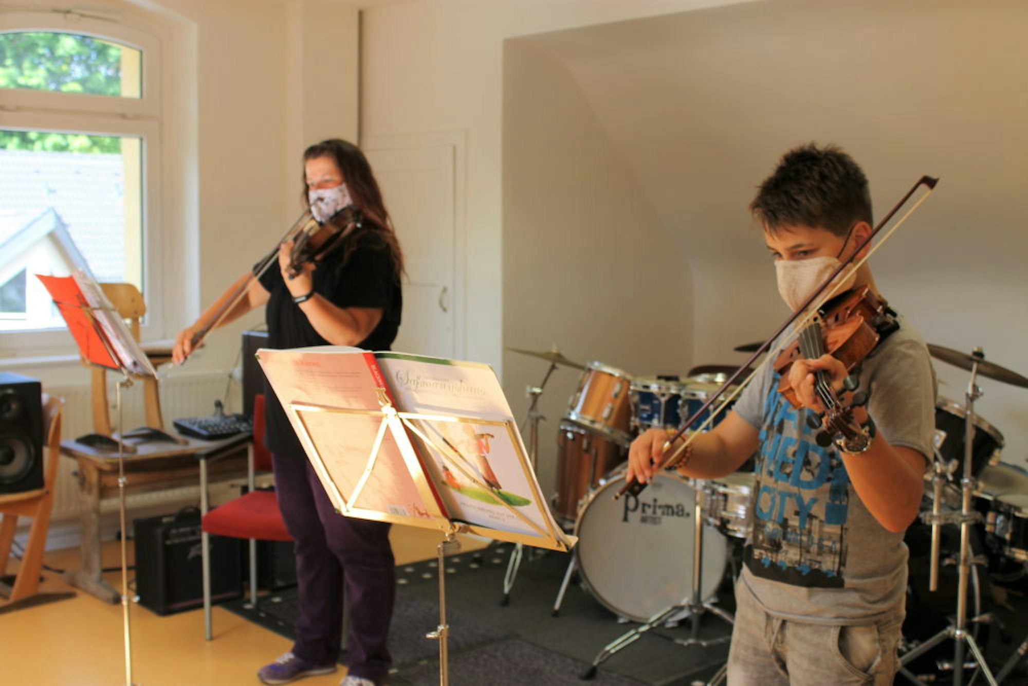 Merlin (12, rechts) ist froh, endlich wieder mit seiner Lehrerin Jana Matyasova von der Musikschule Schleiden spielen zu können.