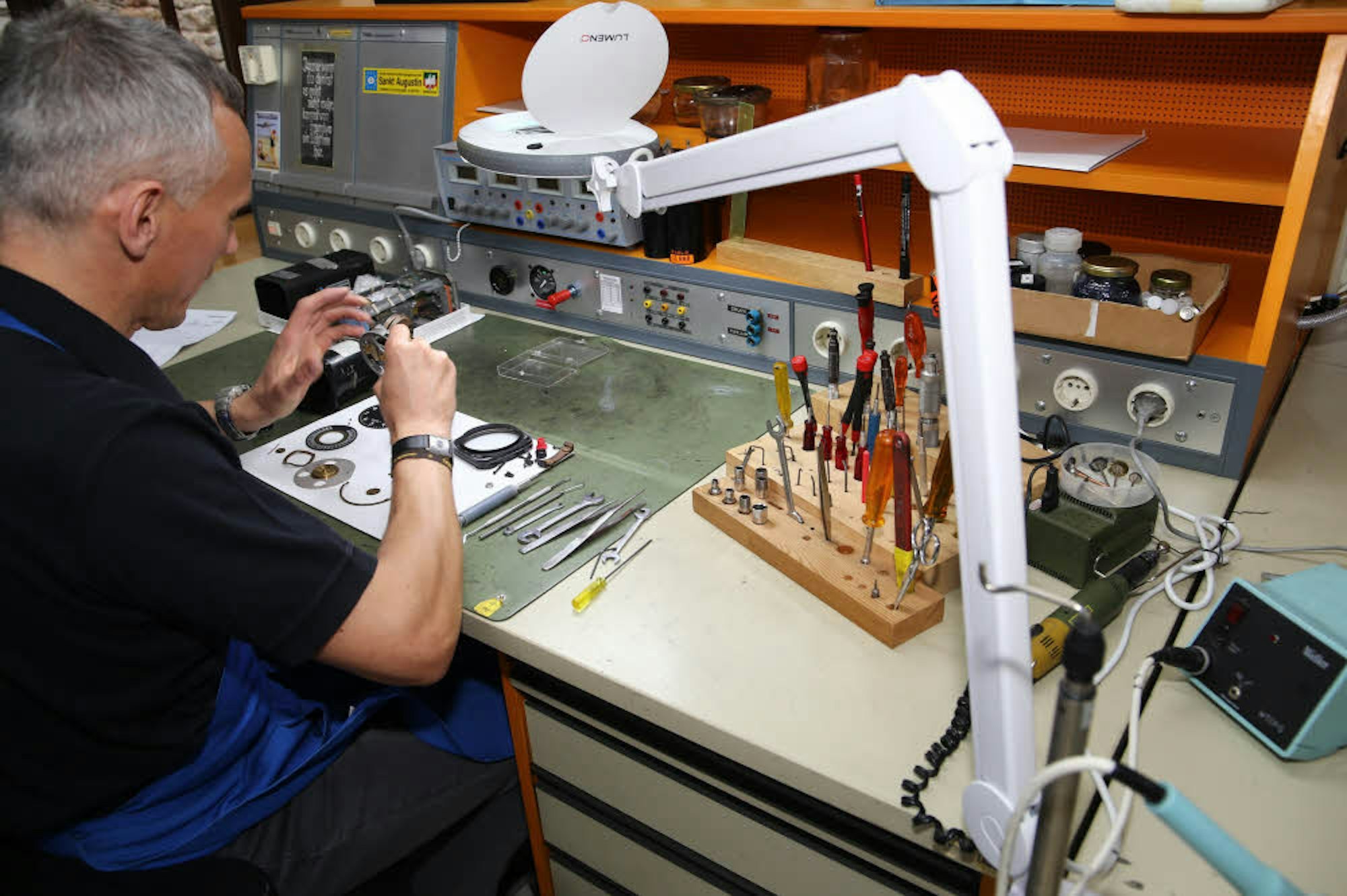 Konzentriert arbeitet Dietmar Maus an einem Höhenmesser, der in seine Einzelteile zerlegt werden musste.