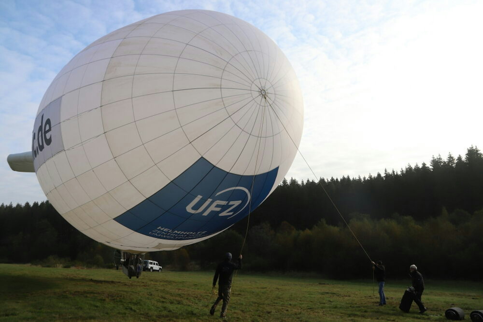 Doch plötzlich ist ein ungewohntes Geräusch zu hören. Ein Flappen, ein laufender Motor und immer wieder ein kräftiges Fauchen, das so gar nicht zu der friedlichen Szenerie passen will. Knapp über den Bäumen schiebt sich ein weißes Stoffungetüm über die Wipfel und schwebt langsam über das Tal. Ein Zeppelin ist über dem Waldstück unterwegs. Der Urheber des fremdartigen Schauspiels gibt sich durch ein großes Logo zu erkennen: UFZ – Helmholtzzentrum für Umweltforschung.
