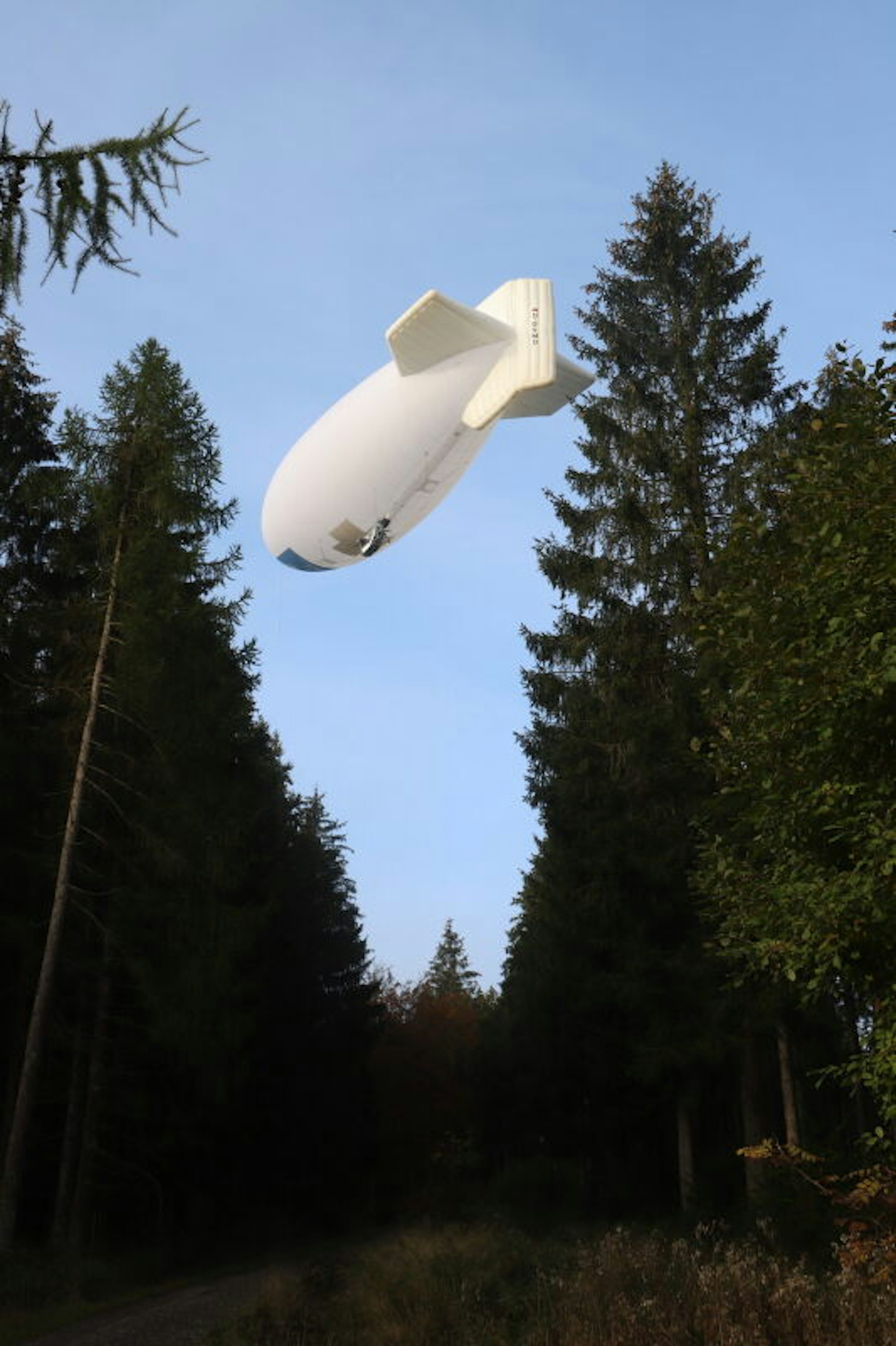 In 20 bis 60 Metern Höhe ist der Zeppelin – im Fachjargon wird die hier genutzte Bauart Blimp genannt – zu Forschungszwecken ziemlich knapp über den Baumwipfeln des herbstlichen Wahlerscheider Waldes unterwegs.