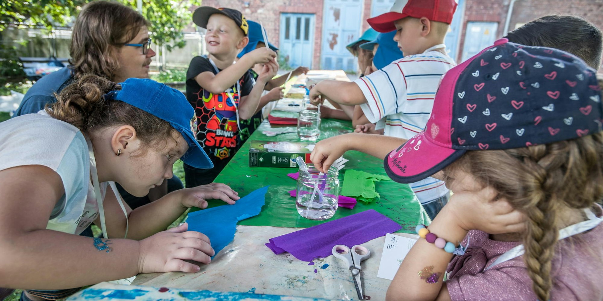 Leverkusen – Jason ist schüchtern. Er zeigt nur auf das, was er möchte, den Mund öffnet er nicht, hält die Hand von Katharina Paszkoski fest gedrückt. „Das ist auch kein Wunder, es ist der erste Ausflug seit Corona, den wir machen können“, sagt die Erzieherin. Mit neun Vorschulkindern aus der städtischen Kita Stralsunderstraße sind sie zum Sensenhammer gekommen, zum „Aktionstag der kleinen Forscher“.