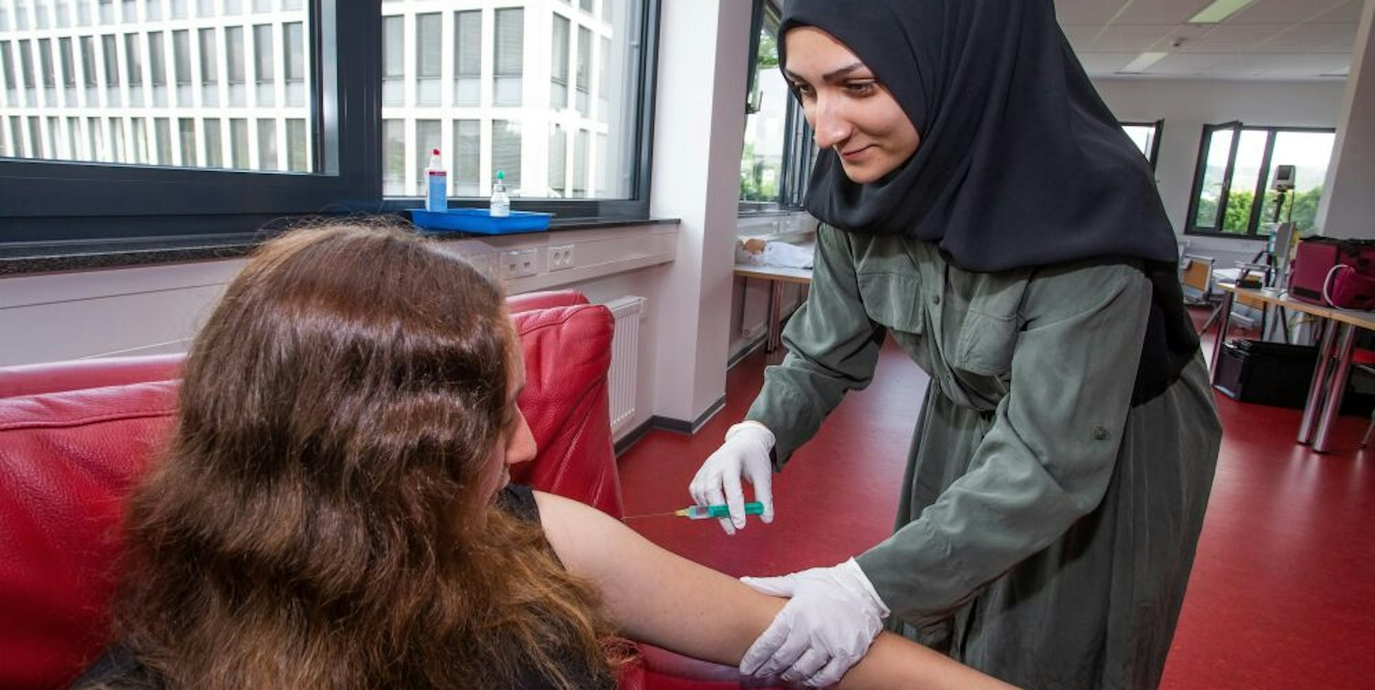 Gummersbach – Hände desinfizieren, Handschuhe überstreifen, Spritze aufziehen, den Patienten für die Injektion vorbereiten: Routiniert geht die angehende Pflegefachfrau Amina Sacirovic im neuen Skills-Lab des Gesundheits- und Bildungszentrum (GBZ) auf dem Gummersbacher Steinmüllergelände den Vorgang Schritt für Schritt durch. Derweil hat es sich ihre Mitschülerin Franziska Gering in einem roten Sessel bequem gemacht und wartet auf den Pieks. „Wenn der Patient mich fragt, ob das weh tut, kann ich ihm nur ehrlich antworten, wenn ich selber weiß, wie es sich anfühlt“, sagt die 20-Jährige.