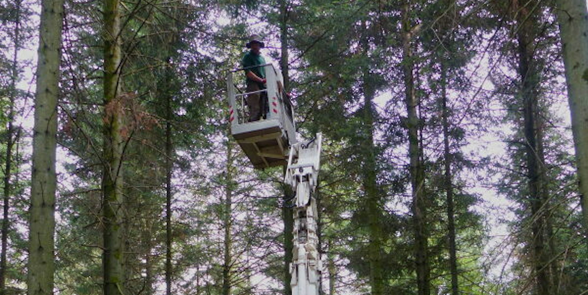 In rund 30 Metern Höhe ernten die Forstwirte die Zapfen von Weißtannen und Douglasien.