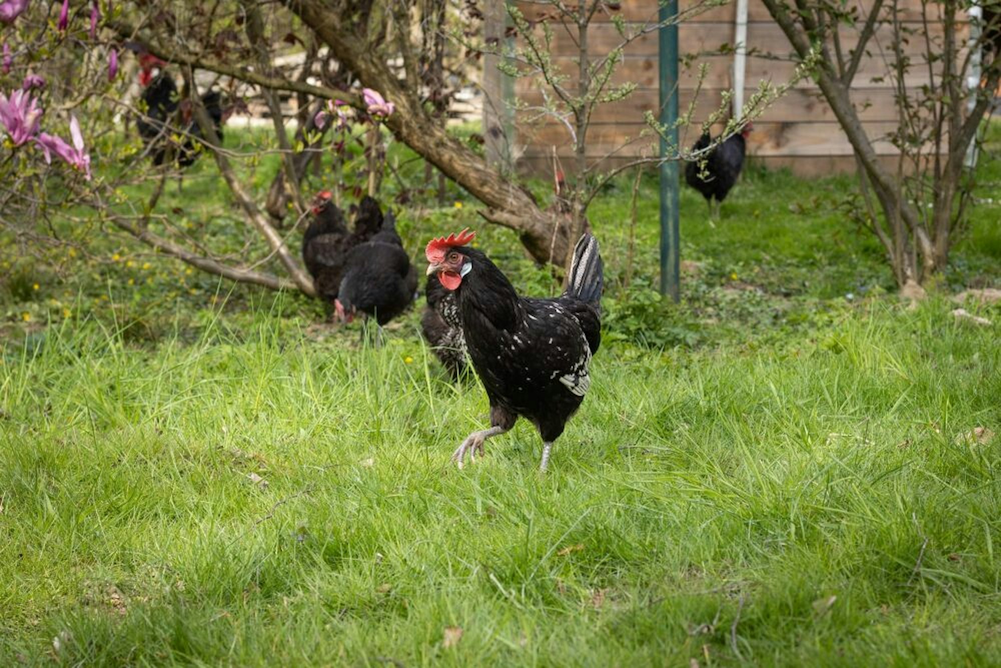 Daneben murmelt der Lindchenbach unverrohrt durch den Garten. Auf kleinen Parzellen in der Mitte werden Kartoffeln, Zwiebeln, Kohl, Porree angebaut. Zum Düngen holt Bee , angelehnt an eine Kreislaufwirtschaft wie in der biologischen Landwirtschaft, Pferdemist aus Oedinghausen. Der Garten selbst ist zu klein für vierbeinige Haustiere. Dafür dient er einer lebhaften Hühner-Gruppe als Refugium. Der Hahn und einige der acht Hühner sind reinrassige Bergischer Schlotterkämme, gehören also einer heute vom Aussterben bedrohten, alten bergischen Rasse an und passen somit ebenso perfekt ins Gesamtkonzept wie der Bienenstock mitten im Garten. „Fahrrad-Imker“ Felix Macht betreut die vier Bienenvölker, die dort leben und ihren eigenen Anteil am Wachsen und Gedeihen der Blumen und Früchte haben.