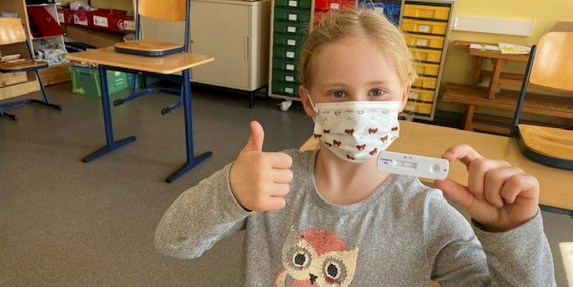 Sarah ist in der dritten Klasse und schon ein echter Testprofi. Sie kennt die Abläufe ganz genau. „Es kitzelt nur ein bisschen. Weh tut es nicht, “ erklärt die 8-Jährige. Langsam führt sie das Teststäbchen in ihr rechtes Nasenloch, vorher hat sie eine spezielle Flüssigkeit in ein kleines Reservoir gefüllt. „Jetzt muss das Stäbchen für eine Minute da rein und dann muss man es wieder entfernen und die Flüssigkeit auf den Test tropfen.“ Nach etwa 15 Minuten ist das Ergebnis da: „Negativ!“