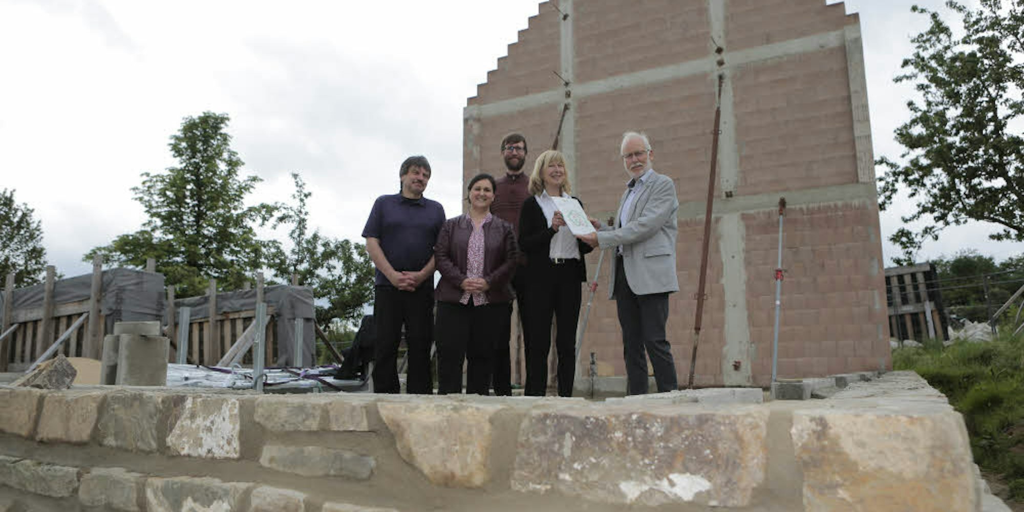 Noch ist die Schule eine Baustelle. Jutta Krumm (2.v.r) übergibt die Förderzusage an Werner Hütt (r.) , den Geschäftsführer des Museums-Fördervereins. Das freut auch Museumsleiter Michael Kamp, Projektleiterin Anka Dawid-Töns und Volontär Stephan Hahn (v.l.) .