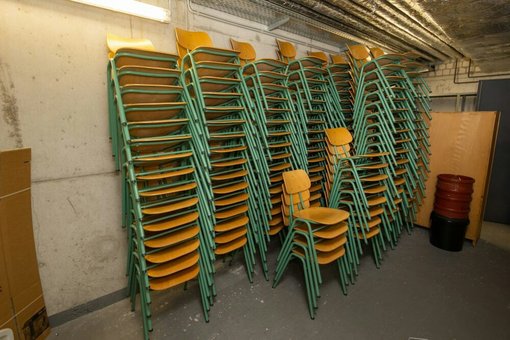 Die Stühle der ehemaligen Schule sind im Keller gestapelt.