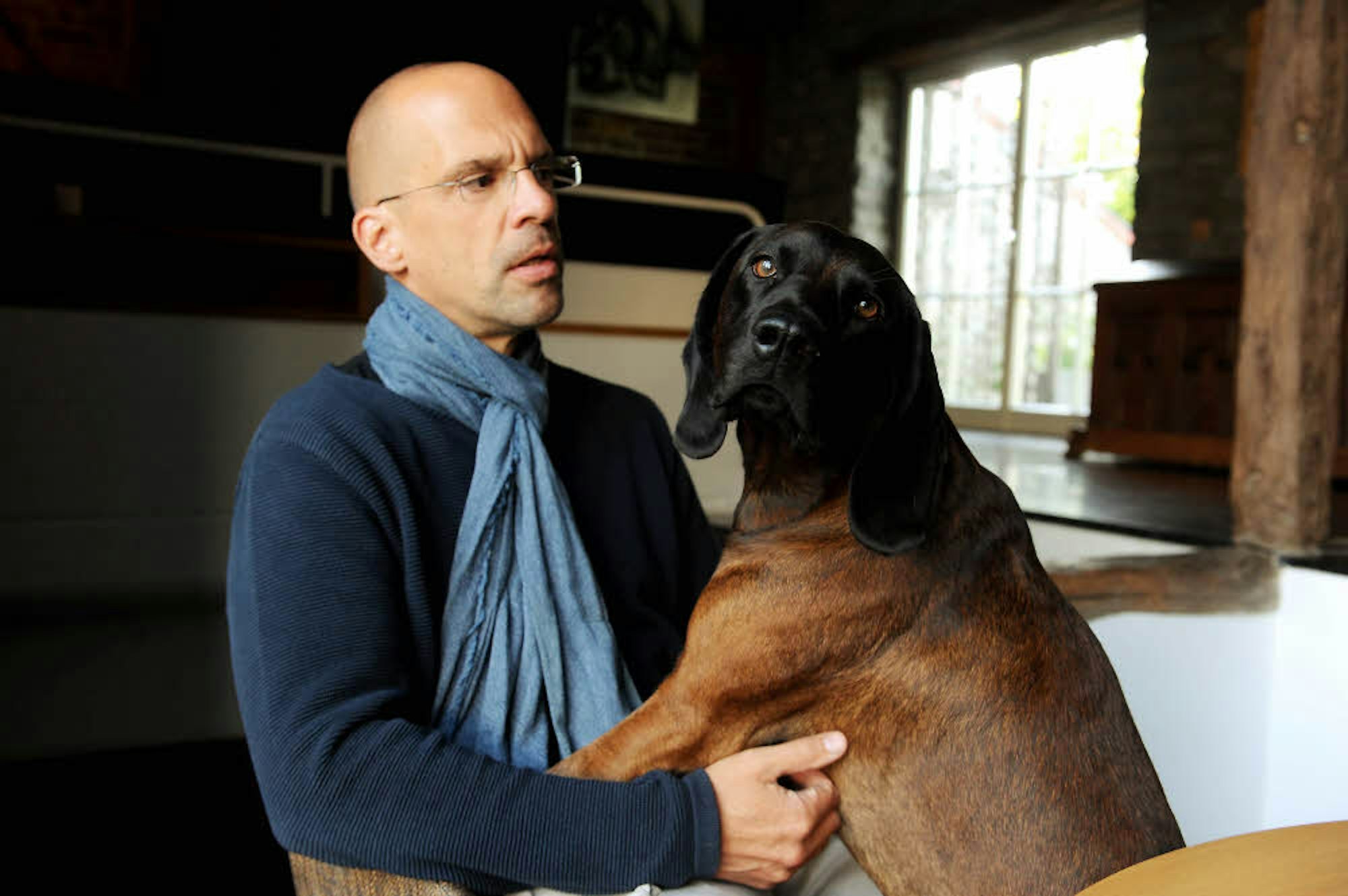Dirk Gratzel mit seinem Hund Emil, der täglich 1,8 Kilogramm CO2 -Äquivalent produzierte.