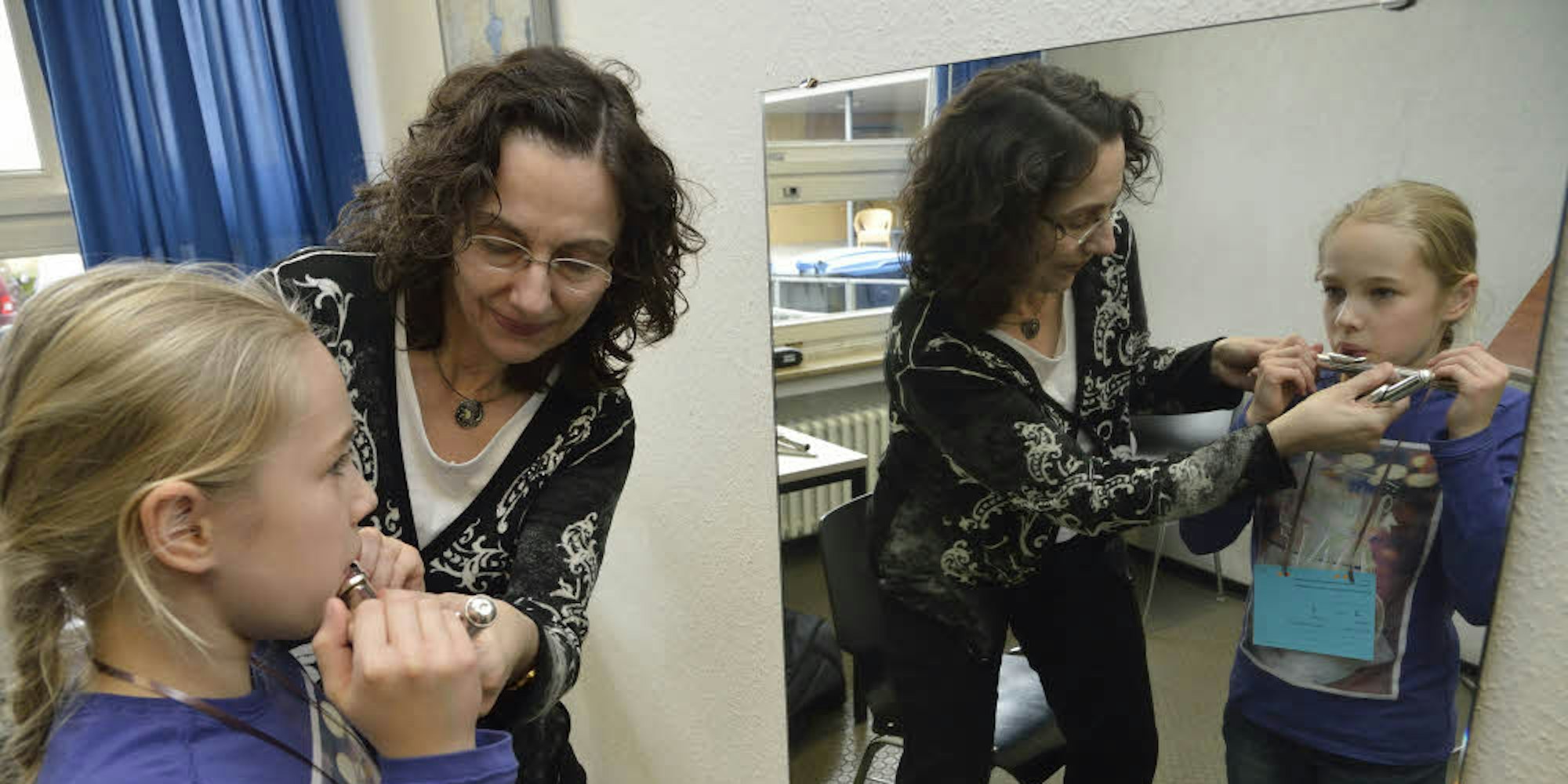 Sophia Bender muss tief Luft holen, um der Querflöte einen Ton zu entlocken. Beate List erklärt ihr, wie das geht.