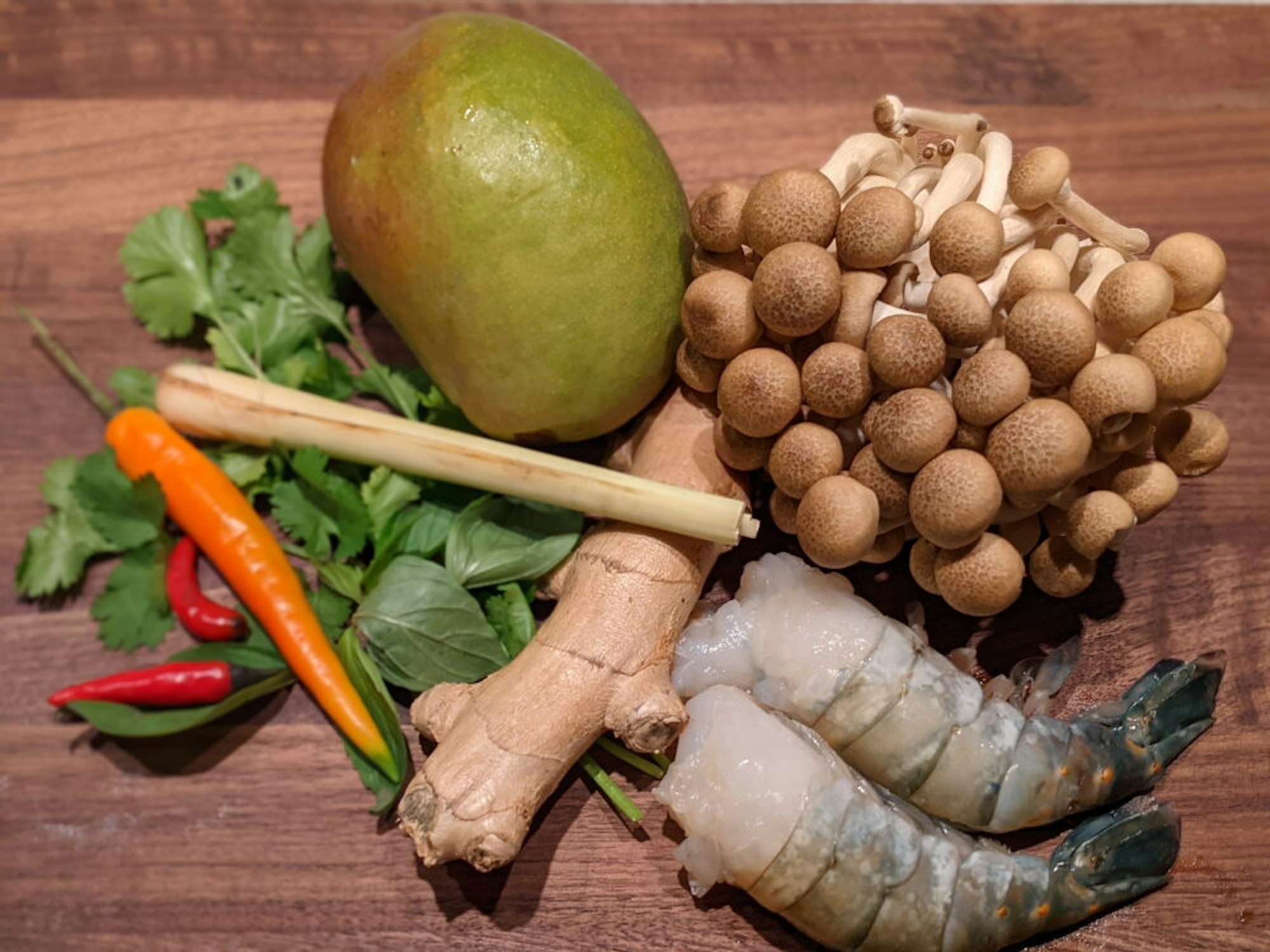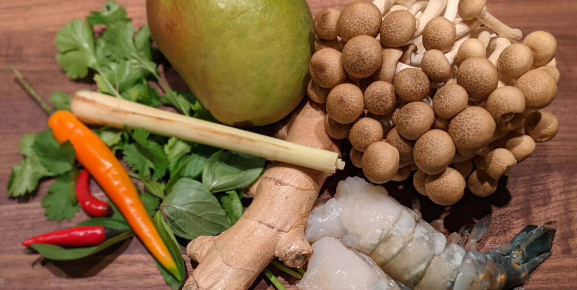 Zutaten für die asiatische Bowl von Birgit Eckes: Garnelen, Shimeji-Pilze, Ingwer, Chilischote, Koriander, Zitronengras.
