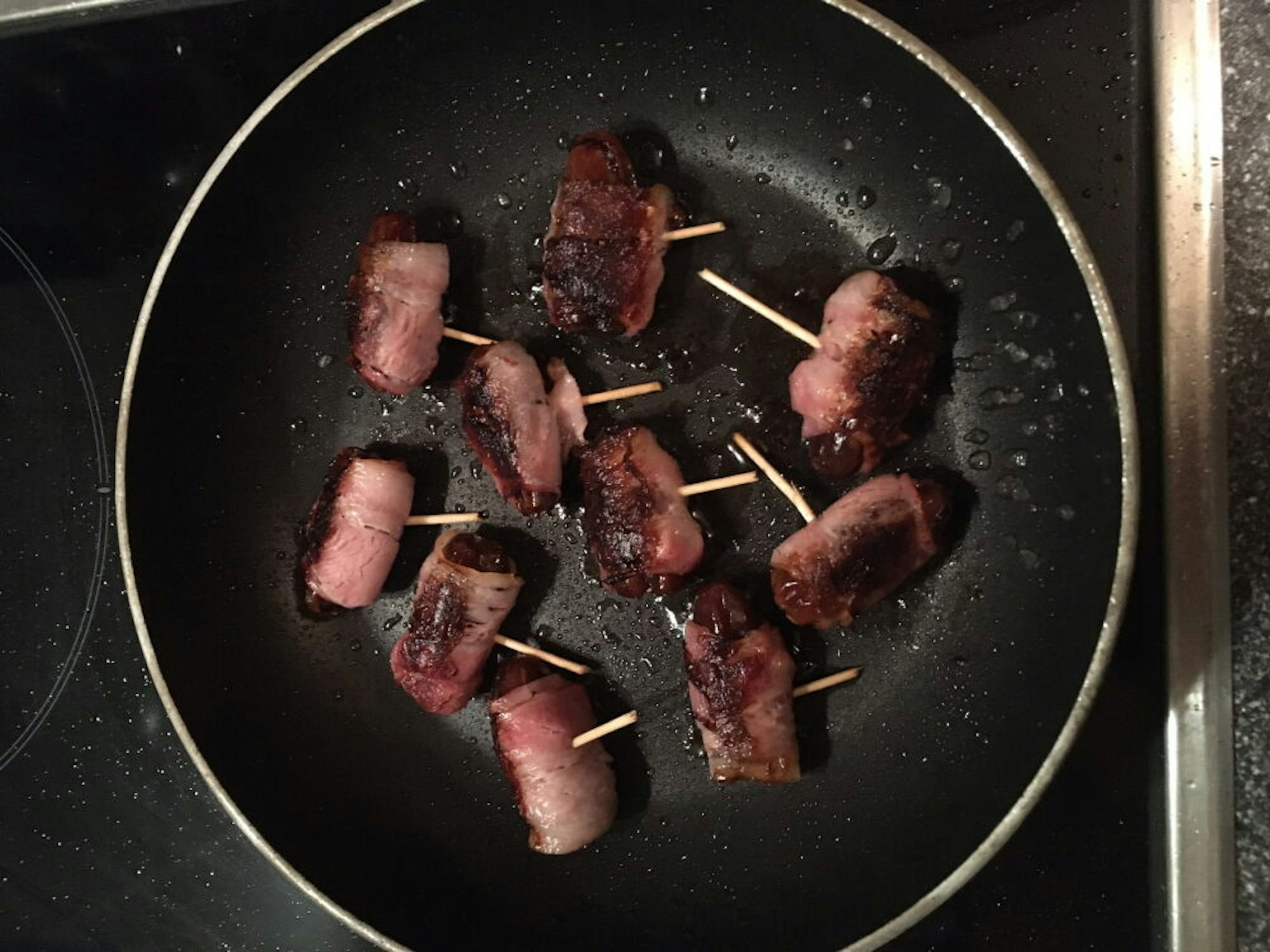 Oder Datiles con Bacon, Datteln im Speckmantel (Zutaten: 4 Datteln pro Person, 1 Paket Frühstücksspeck Bacon, Mandeln, falls gewünscht, Holz-Zahnstocher). Wer mag, kann die Datteln längs aufschneiden und mit je einer Mandel füllen. Den Frühstücksspeck schneidet man auf der Hälfte durch. Dann wird je eine Dattel in ein Stück Frühstücksspeck gewickelt und mit einem Zahnstocher seitlich fixiert. Die Datteln bei mittlerer Hitze von beiden Seiten in der Pfanne bräunen lassen.