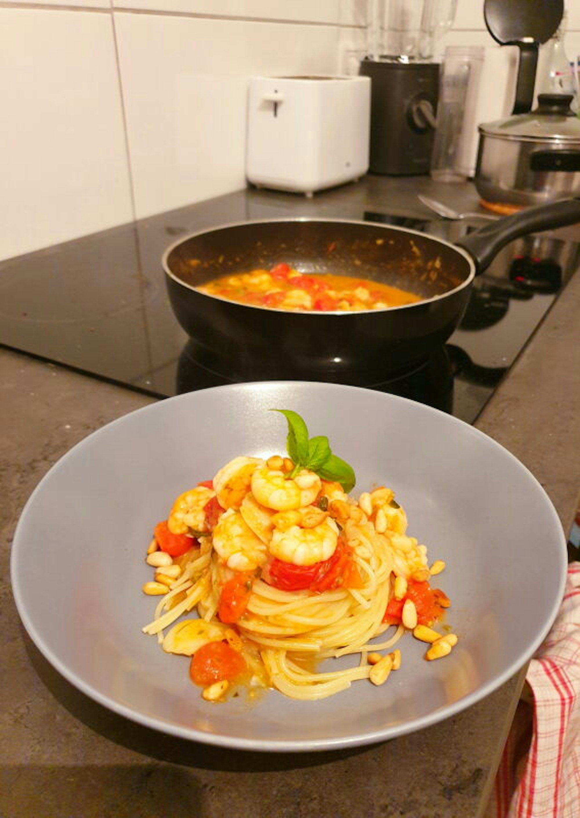 Zutaten für 3-4 Personen: 500 g Riesengarnelen (frisch oder gefroren), 250 g Kirschtomaten, 80-100 g Pinienkerne, 1 Zwiebel, 1-2 Knoblauchzehen, Weißwein, Basilikum, Parmesan, Olivenöl, Spaghetti
