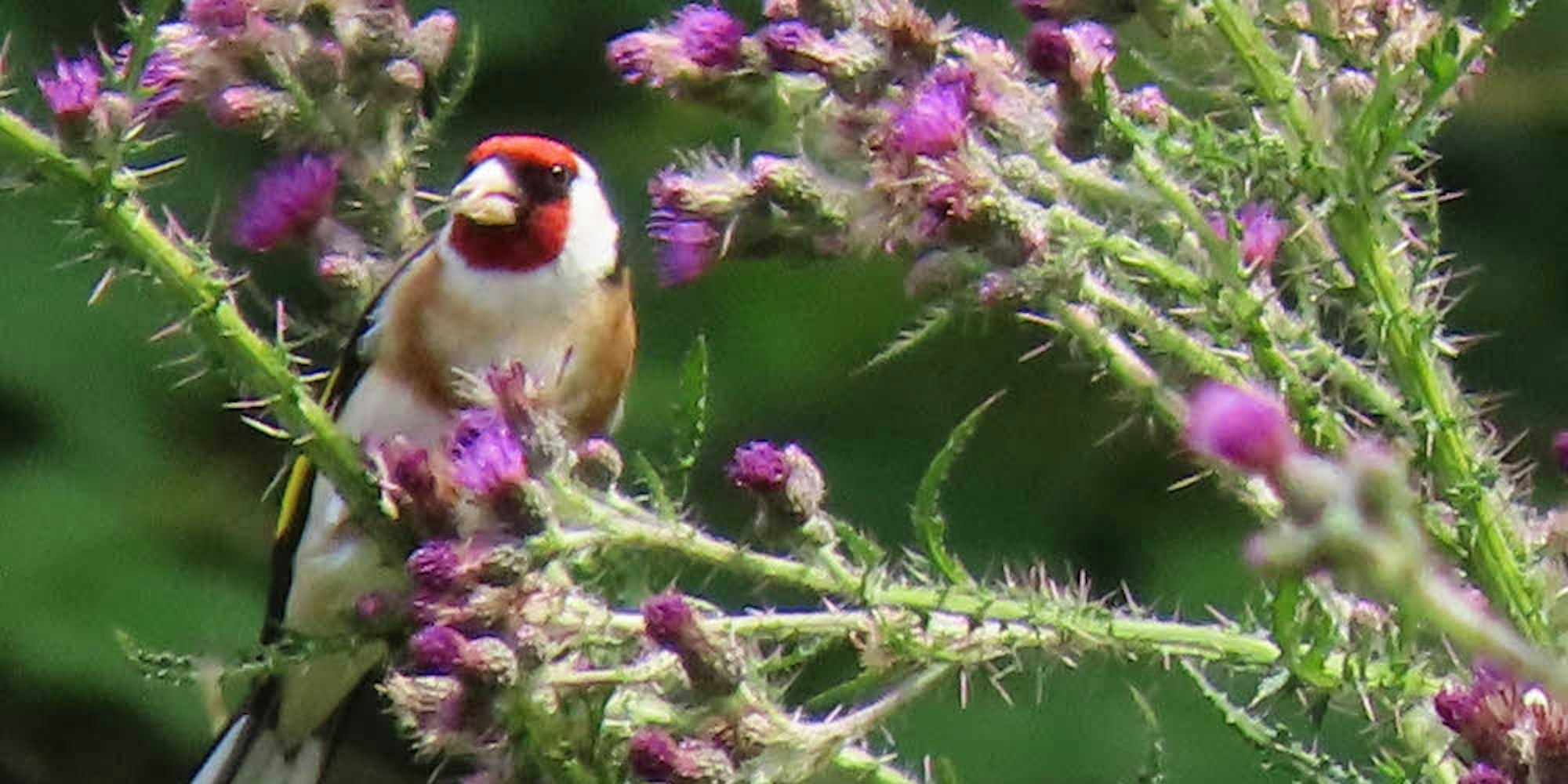 In diesem Frühjahr und Sommer schaue ich aber kaum aus dem Fenster ohne ihn irgendwo in meinen Blickfeld herumturnen zu sehen. Selbst mit der Lesebrille auf der Nase und durch ungeputzte Scheiben ist der exotische Farbcode zu eindeutig, um den Piepmatz zu verwechseln. In England ist er zwar als European Goldfinch unterwegs, das heißt also als Goldfink, wegen seiner gelben Rallye-Streifen an den Flügelkanten wohl, aber eigentlich ist seine rote Gesichtsmaske mit schwarzem Augenstreifen und weißen Backen das charakteristischste Element seiner Aufmachung. Irgendwie sieht es nach Clown aus und dazu passt seine Akrobatik. Und das schwarz-weiß geschachte Flimmern der Schwanzfedern im Flug passt zur karierten Hose.