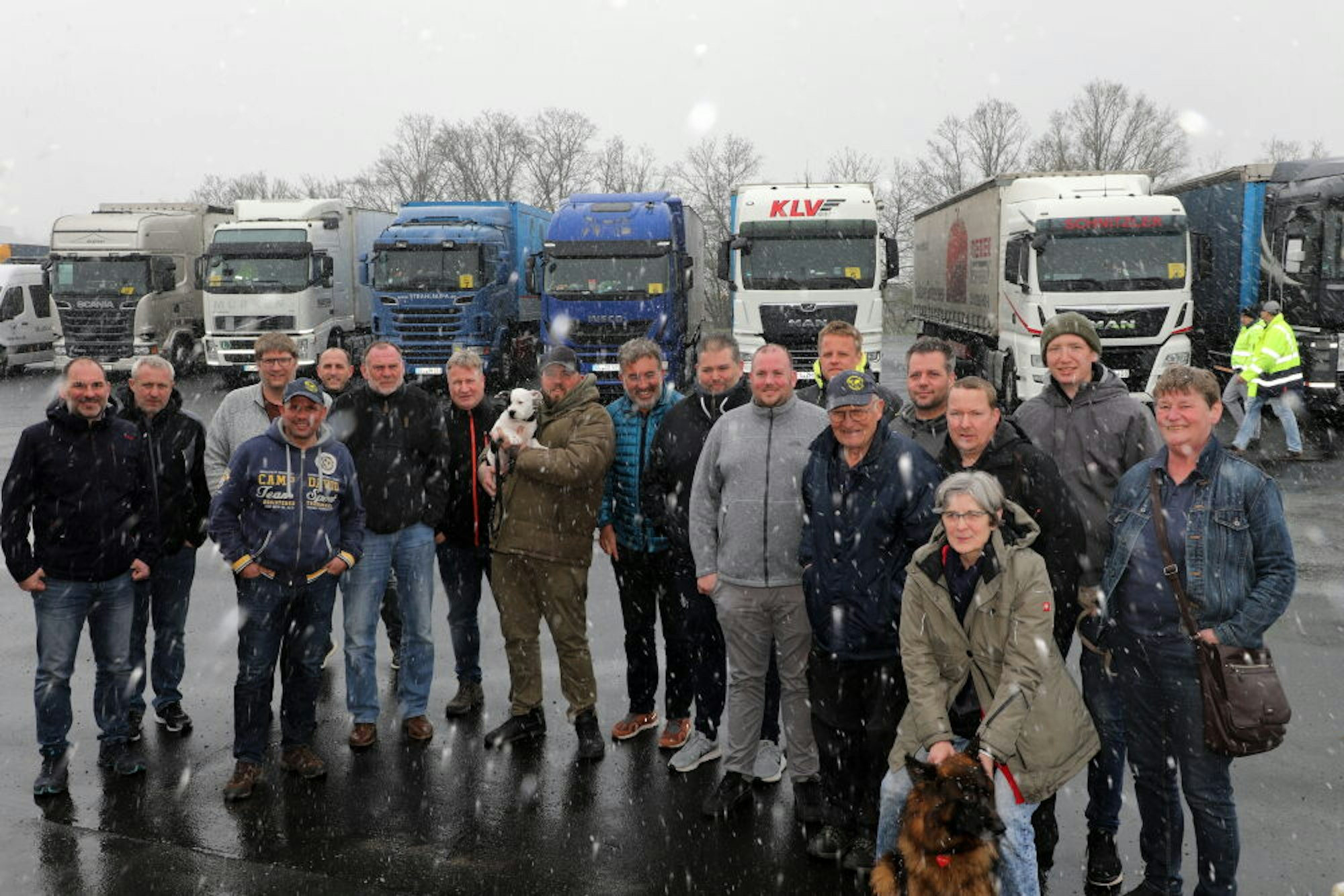 Das Team der Hilfskonvoi-Fahrerinnen und -Fahrer auf der Rückfahrt im Schnee.