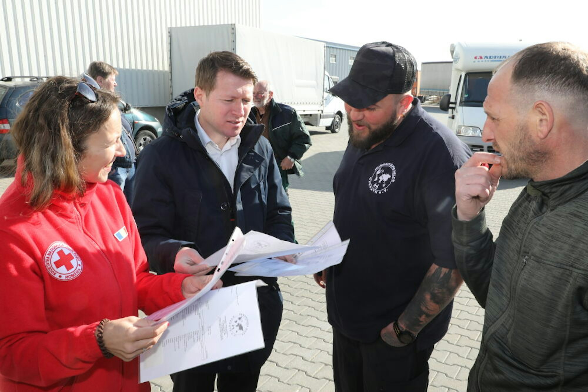 Koordinieren die Übergabe: Sergej Gerliz und Flo Eschbach (v.r.) von der Humanitären Hilfe Overath und rumänische Rot-Kreuz-Vertreter.