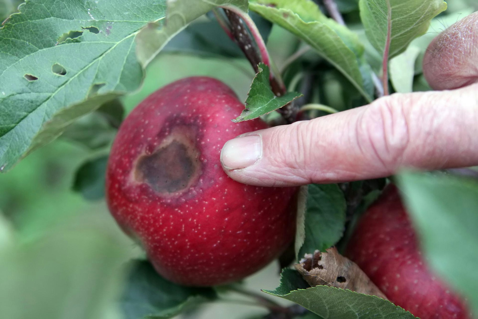 Boekels pflückt ein knallrotes Exemplar der eigentlich recht robusten Spätsorte Natty vom Baum und zeigt auf einen hässlichen braunen Fleck. „Das ist typischer Apfel-Sonnenbrand. Das Fruchtfleisch unter der Schale ist an dieser Stelle ebenfalls braun und aufgeweicht. Wenn die Temperaturen über längere Zeit bei über 30 oder gar 35 Grad liegen, drohen manche Äpfel regelrecht zu verbrennen. Bei anderen leidet die Qualität des Fruchtfleischs, oder sie werden nicht mehr groß genug.“