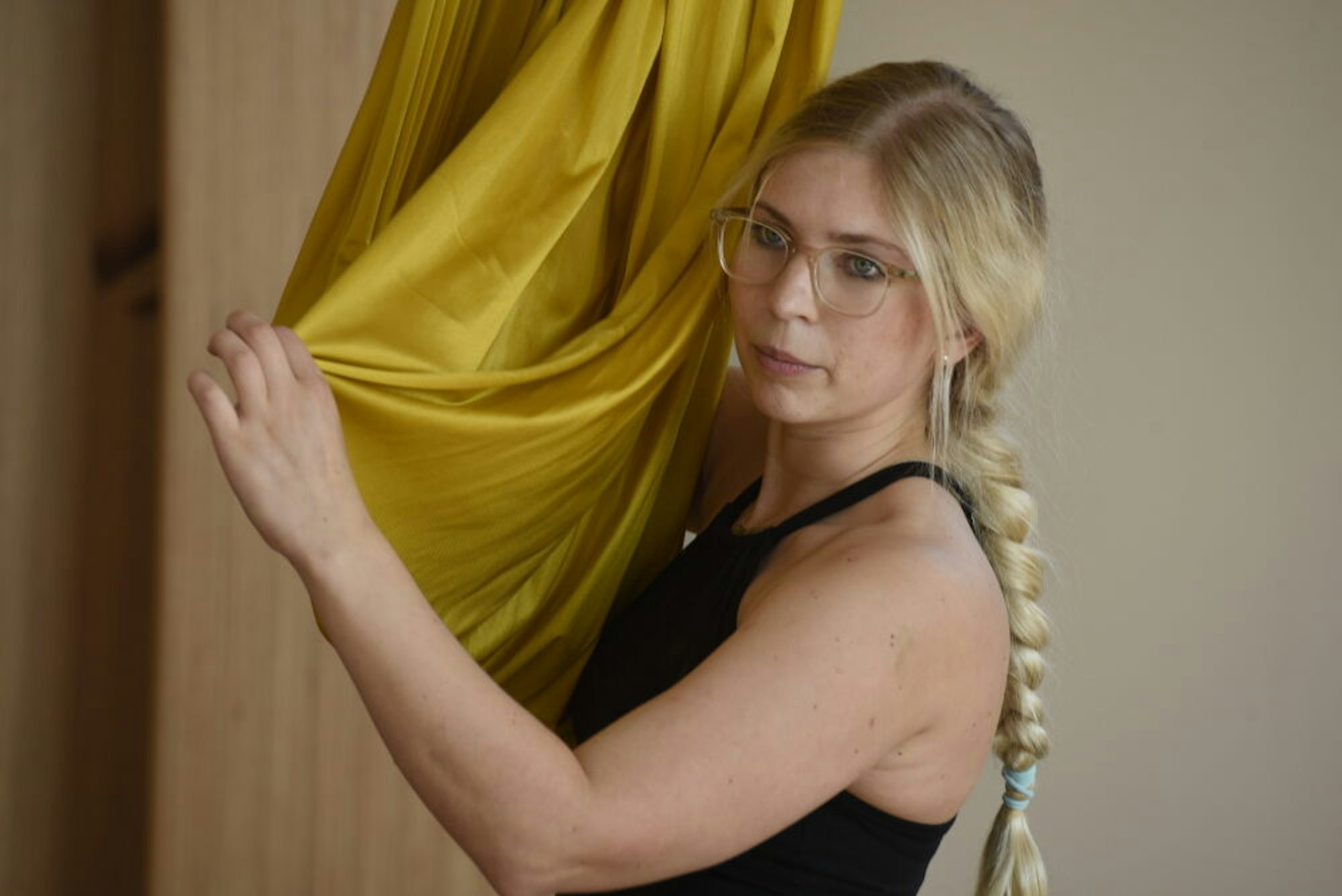 Während Yoga-Lehrerin Michèle Brandt (24) die Übungen vormacht, kann ich mir nur schwer vorstellen, dass auch ich gleich in genau dieser Haltung hängen werde. Zum einen braucht es etwas Überwindung, darauf zu vertrauen, dass das Tuch einen hält. Zum anderen sehen manche Übungen geradezu spektakulär aus. Von unten in das Tuch „springen“ und dabei eine Rückwärtsrolle machen: Klingt wesentlich komplizierter als es ist. „Hier hat sich noch keiner etwas gebrochen“, versucht uns Michèle Brandt zu beruhigen. „Bisher sind alle unverletzt nach Hause gegangen.“ 2016 hat Brandt die Ausbildung für Aerial-Yoga gemacht, davor hat sie die 200 Stunden Vinyasa-Yogalehrer-Ausbildung absolviert.