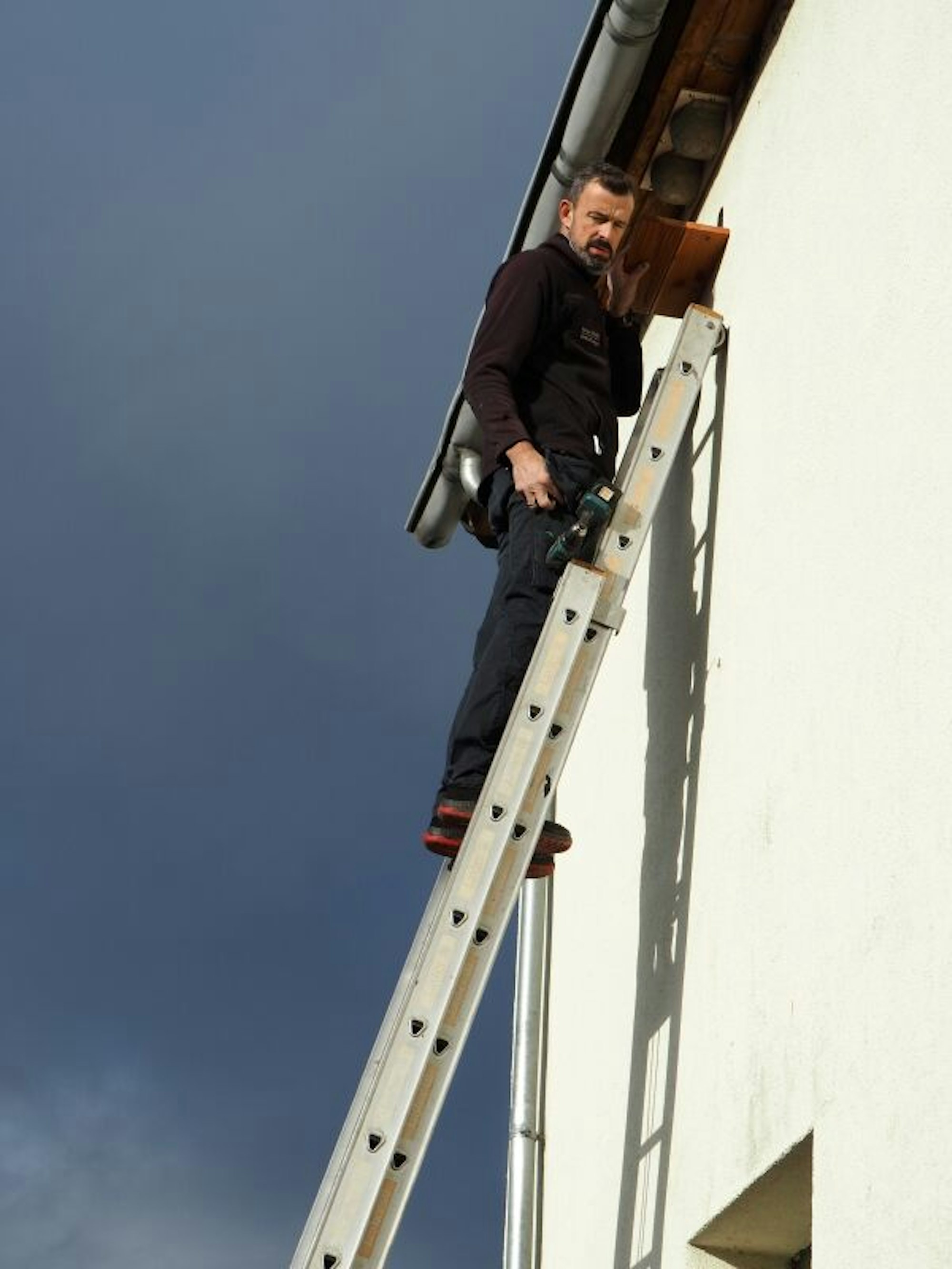 Bei der Aktion bekam die 39-Jährige tatkräftige Unterstützung von Jochen Sahm. Der Dachdeckermeister aus Bliesheim stieg auf die Leiter und brachte Nisthilfen und Brettchen an.