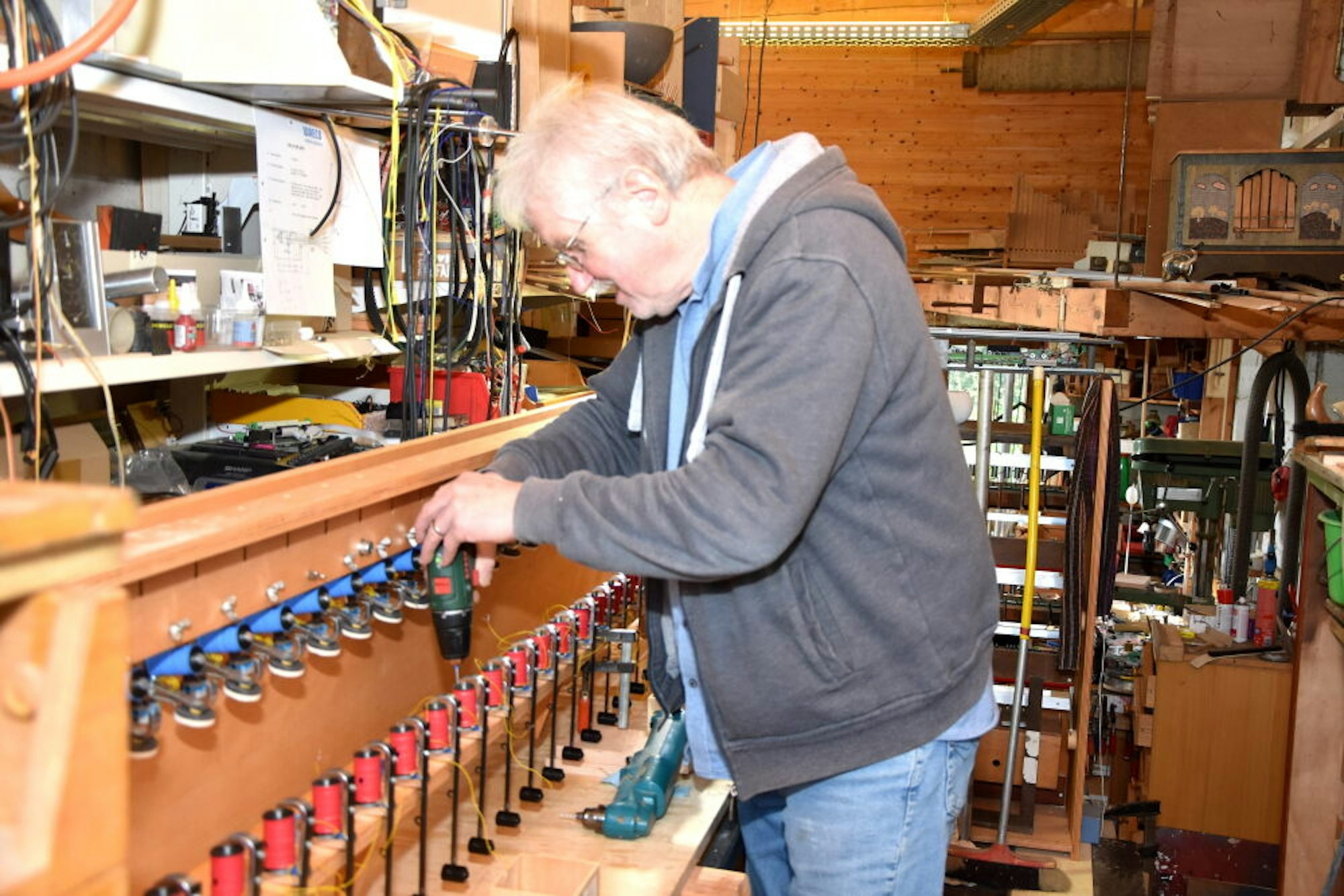 Auf einer seiner vielen Werkbänke stehen Gehäuse und Innenleben eines 27-tönigen Carillons für eine Kirchenorgel im Emsland. In Kürze sollen die Messingröhren geliefert werden, dann ist auch dieses Projekt fertig zum Einbau.