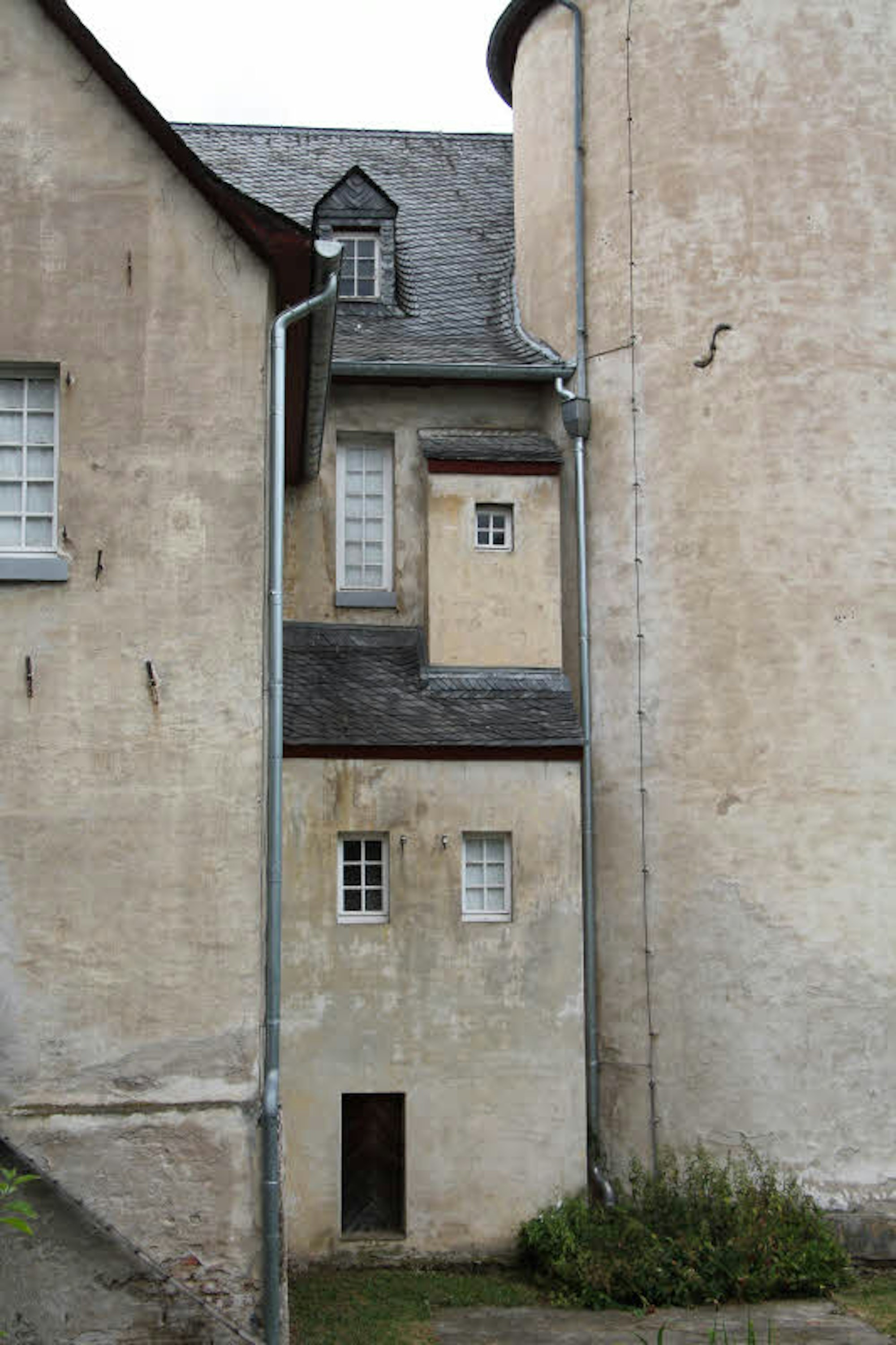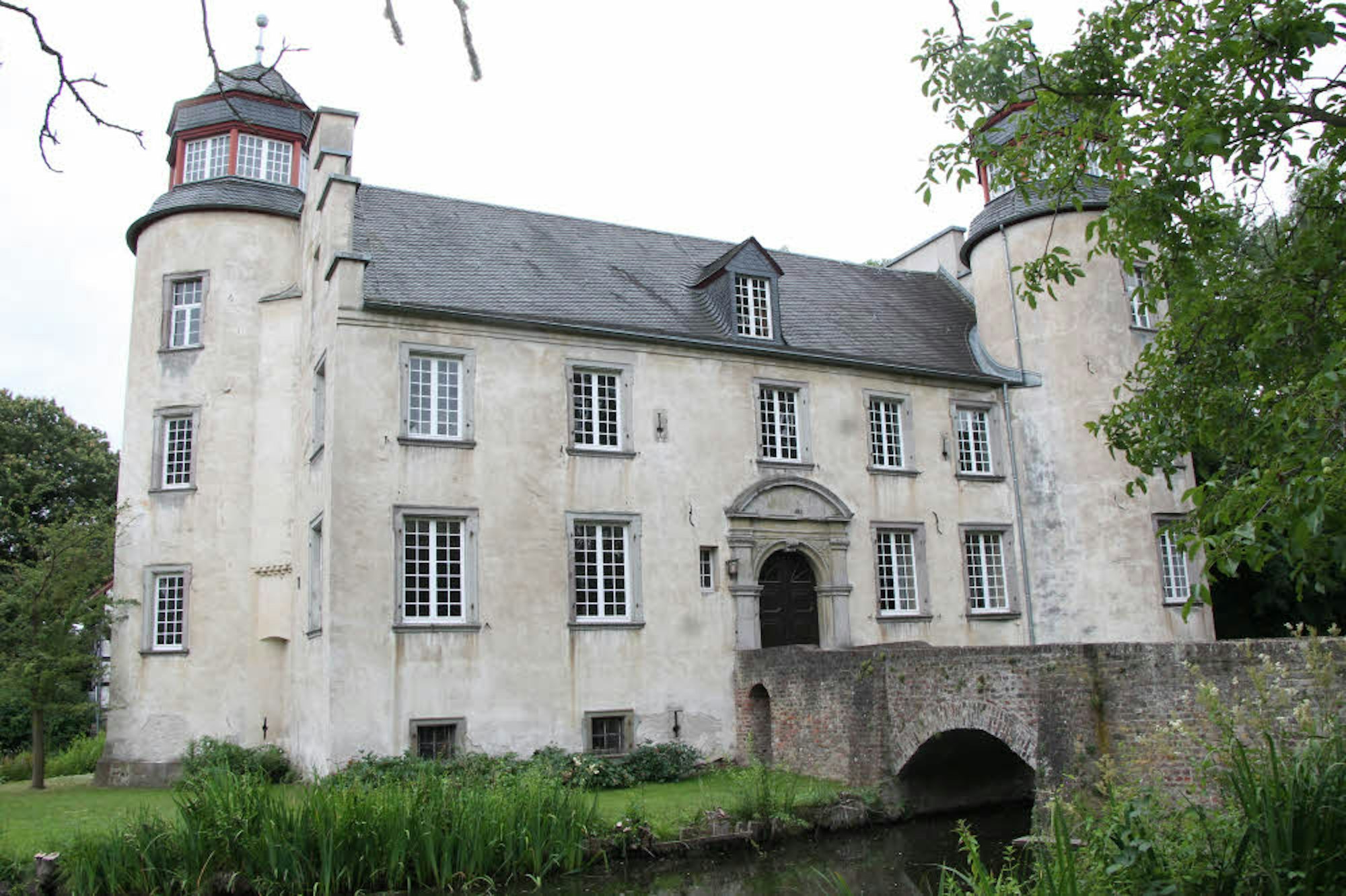 Die heute bestehende bauliche Anlage geht zum Großteil auf das späte 17. Jahrhundert zurück. Wesentlich älter ist allerdings der gotische Treppengiebel. Auf die wehrhafte Zeit der Burg verweisen der Wassergraben, die Schießscharten und die beiden diagonal versetzten Türme. „Von dort oben konnten alle vier Seiten der Burg verteidigt werden“, sagt Lennartz.