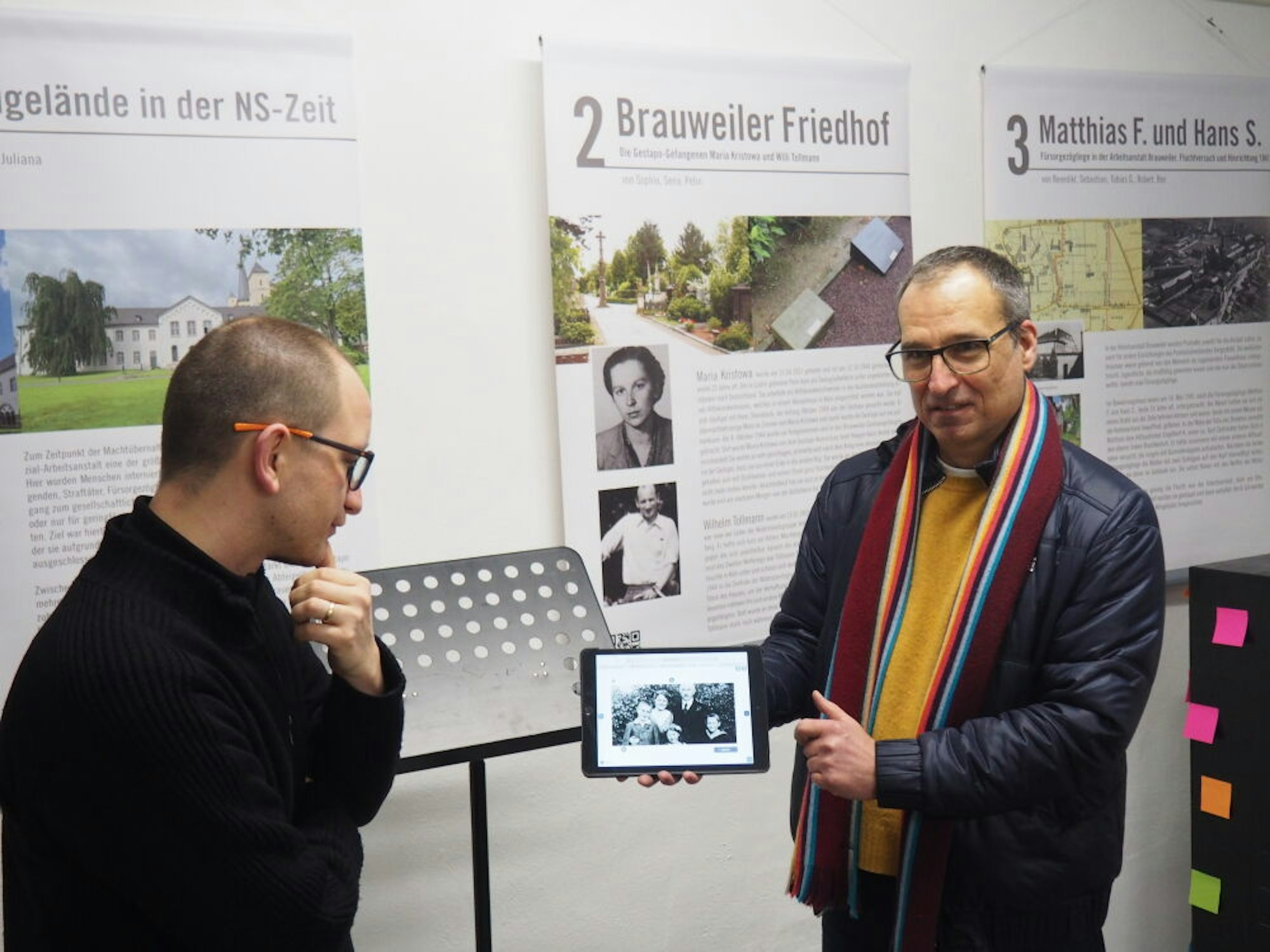 Auf diese Weise rekonstruieren sie die tragischen Ereignisse des Jahres 1941. Damals versuchten zwei schwer erziehbare Jugendlich (Fürsorgezöglinge) aus der Arbeitsanstalt zu fliehen. Der Versuch scheiterte, sie wurden hingerichtet. Auch Videos des LVR sind zusehen. Wer den QR-Code einscannt, erhält all diese Informationen aufs Handy.