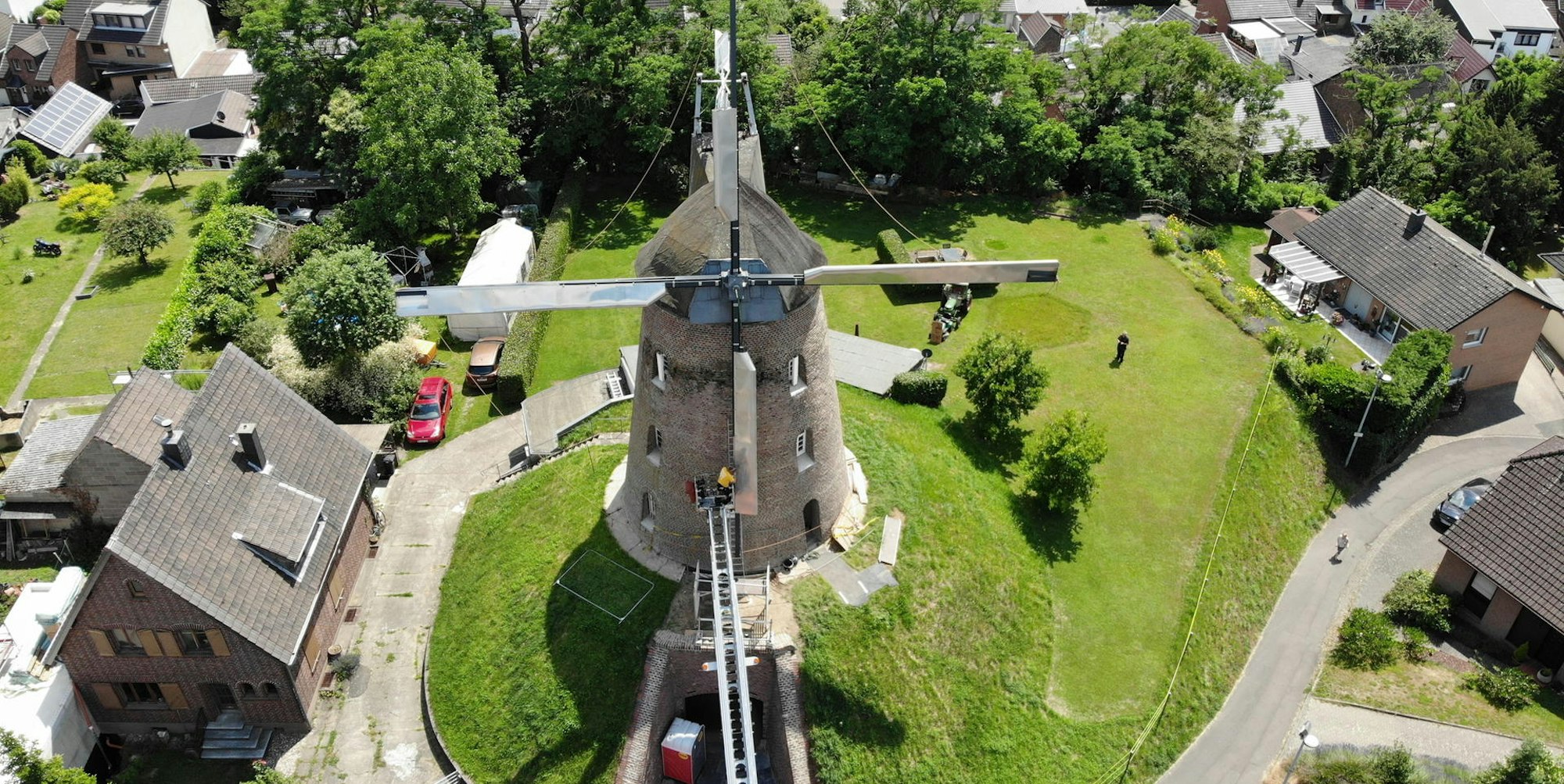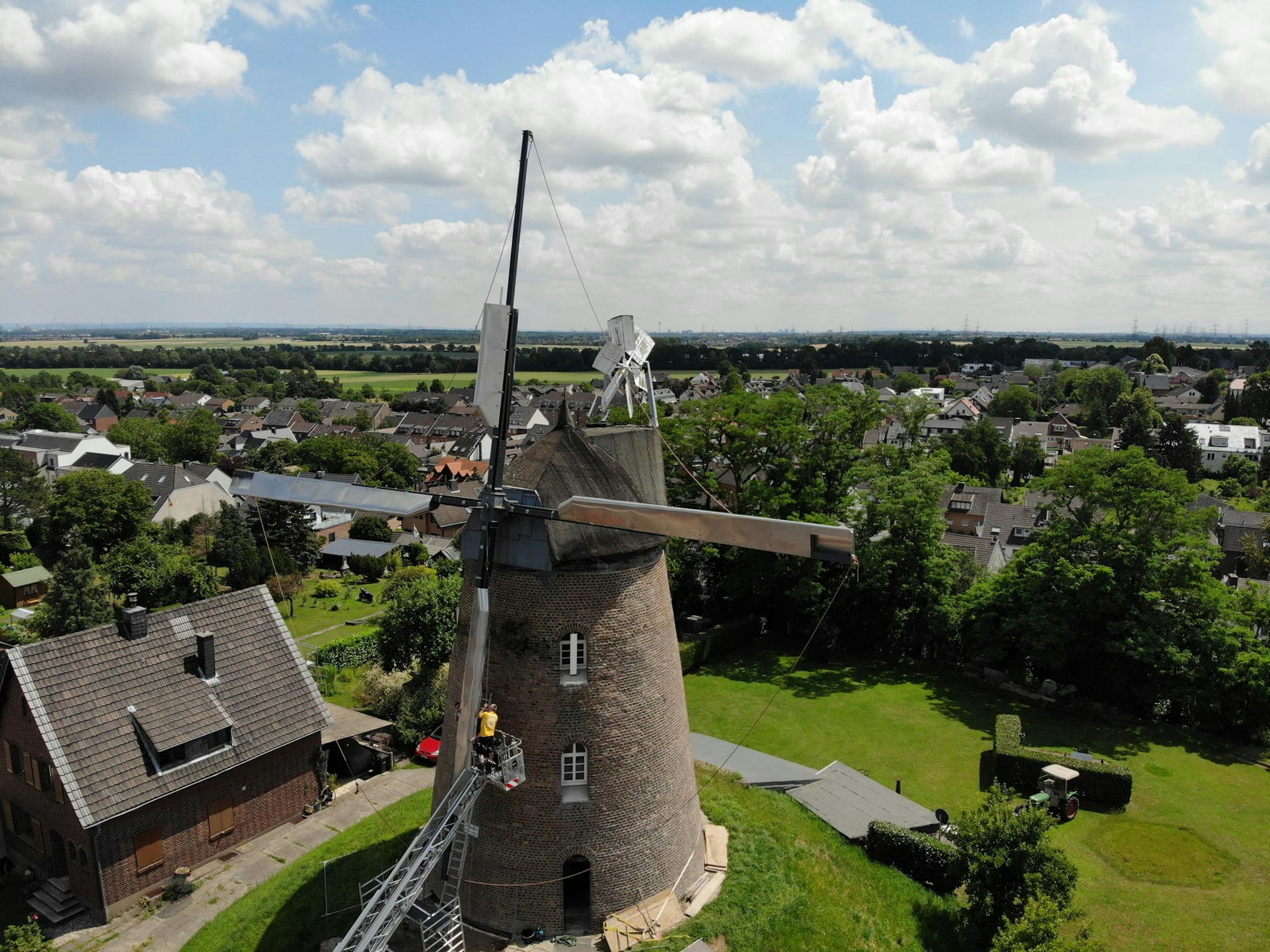 Pulheim-Stommeln – Die Mühle, Wahrzeichen Stommelns, ist fast wieder ganz die alte. Monatelang haben Mitarbeiter der niederländischen Mühlenbau Vaags & Groot Wesseldijk GmbH die Flügel saniert. Jetzt werden sie von den Fachleute montiert.