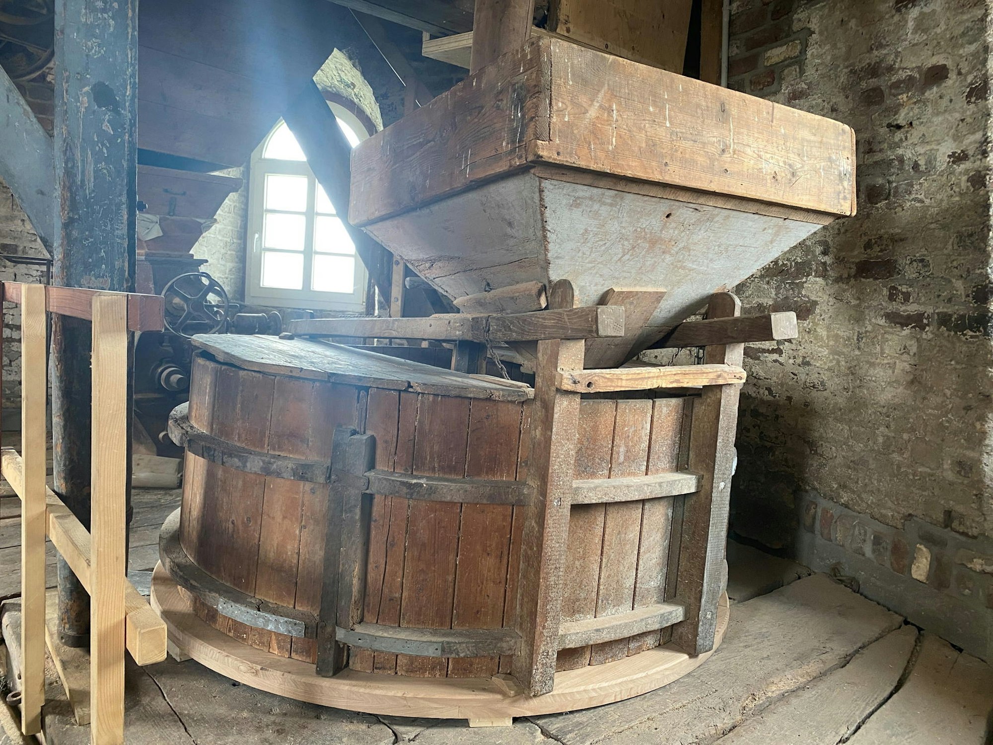 Aufwendig sei der Austausch der rund 65 Balkenköpfe im Innern der Mühle gewesen. „Da sie im feuchten Mauerwerk lagen, waren sie fast alle verrottet, sie wurden alle ausgetauscht“, sagt Stenger. Allerdings haben die Fachleute nicht den kompletten Balken ersetzt, sondern nur die Köpfe und ein bis zu 60 Zentimeter langes Stück. „Dann haben wir ein neues Balkenstück eingesetzt, beide Teile mit Stahlblechen verbunden und mit Stahldübeln fixiert.“ Instand gesetzt ist auch die Mechanik. „Die Mühlenbauer haben die Antriebselemente so hergerichtet, dass sich die Flügel und einer der Mühlensteine wieder drehen können.“