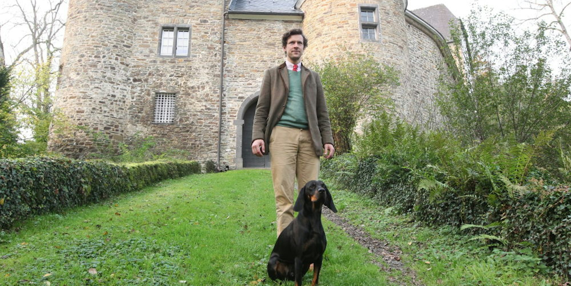 Max Graf Nesselrode und sein Hund Enzo vor dem Bürotrakt von Burg Herrnstein.
