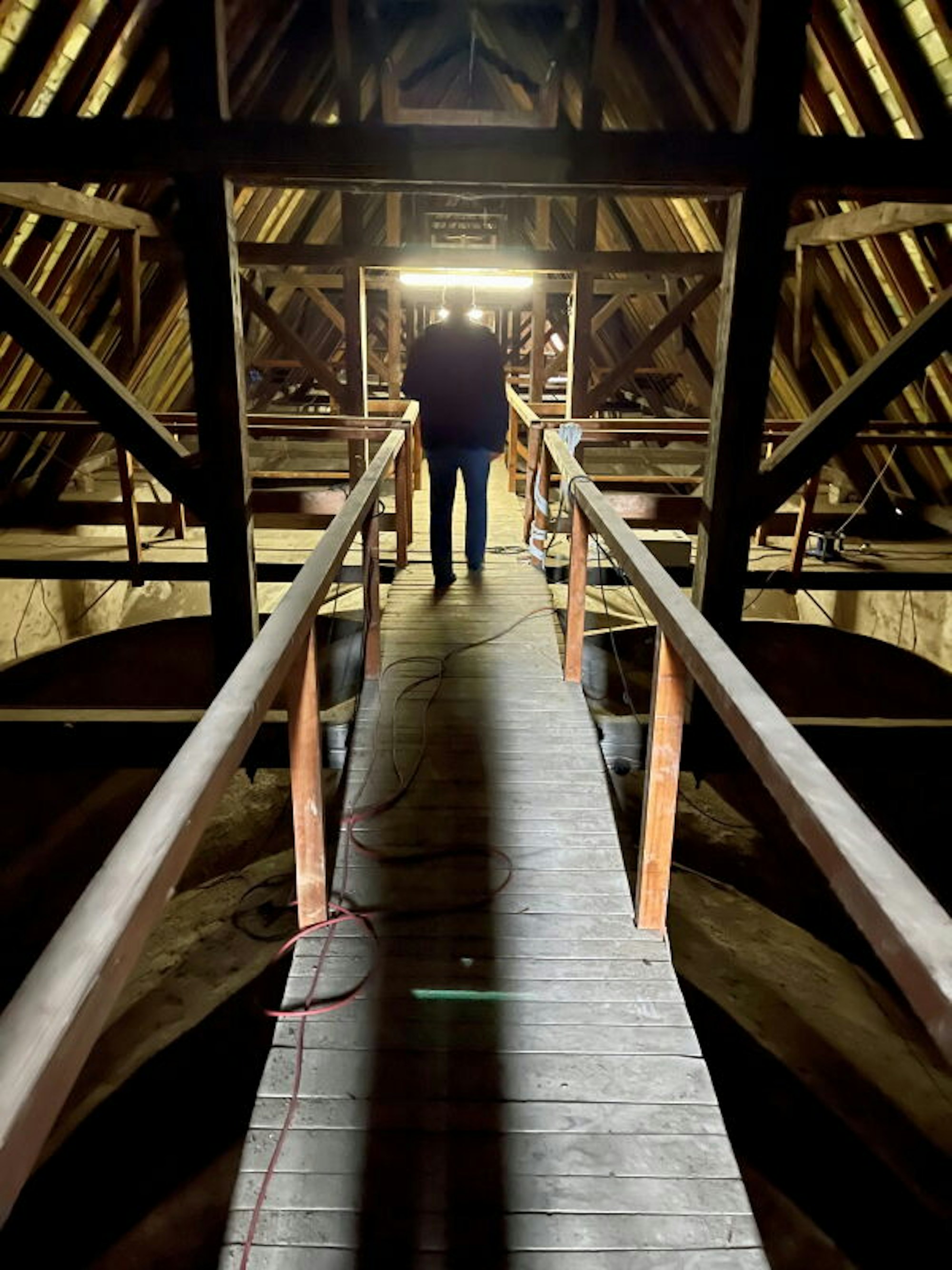 Ein schmaler Holzsteg führt über das Dach des Kirchenschiffs.