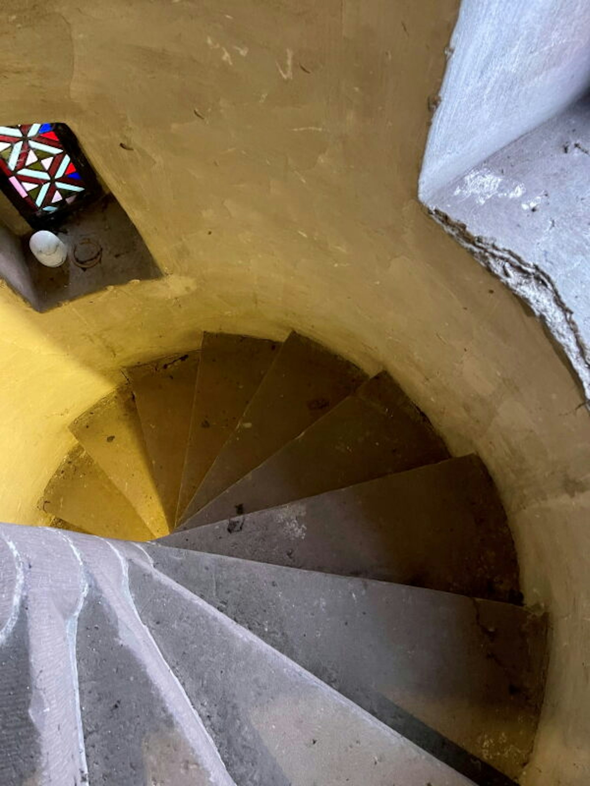 100 Stufen hat die schmale Wendeltreppe zum Turm.