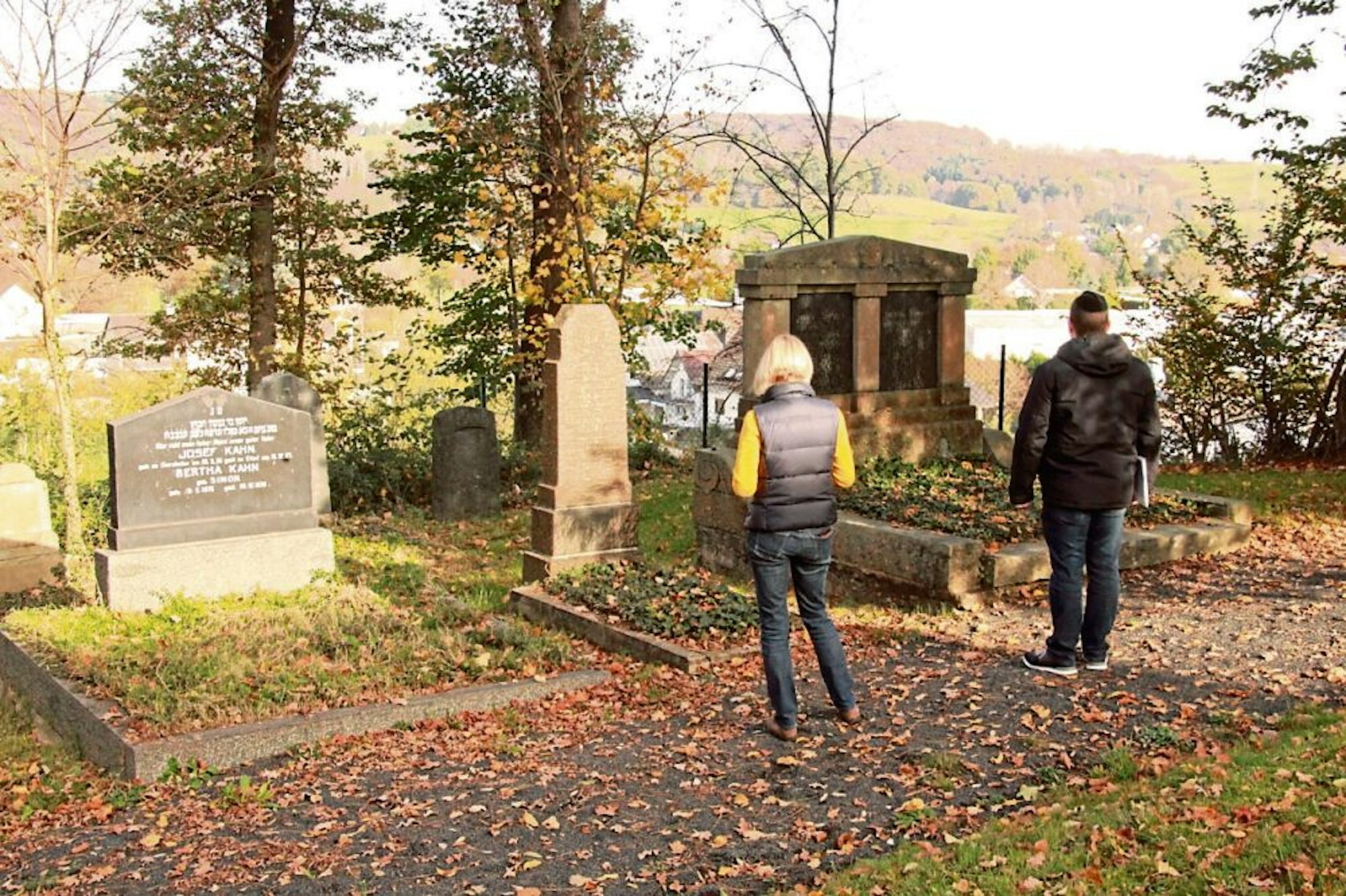 Judith Neulen und Matthias Ennenbach am Grab der Eheleute Juli und Jakob Simon, die 1918 als erste auf dem Jüdischen Friedhof in der Straße Am Ersfeld bestattet wurden.