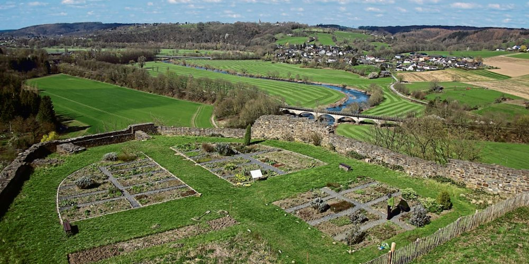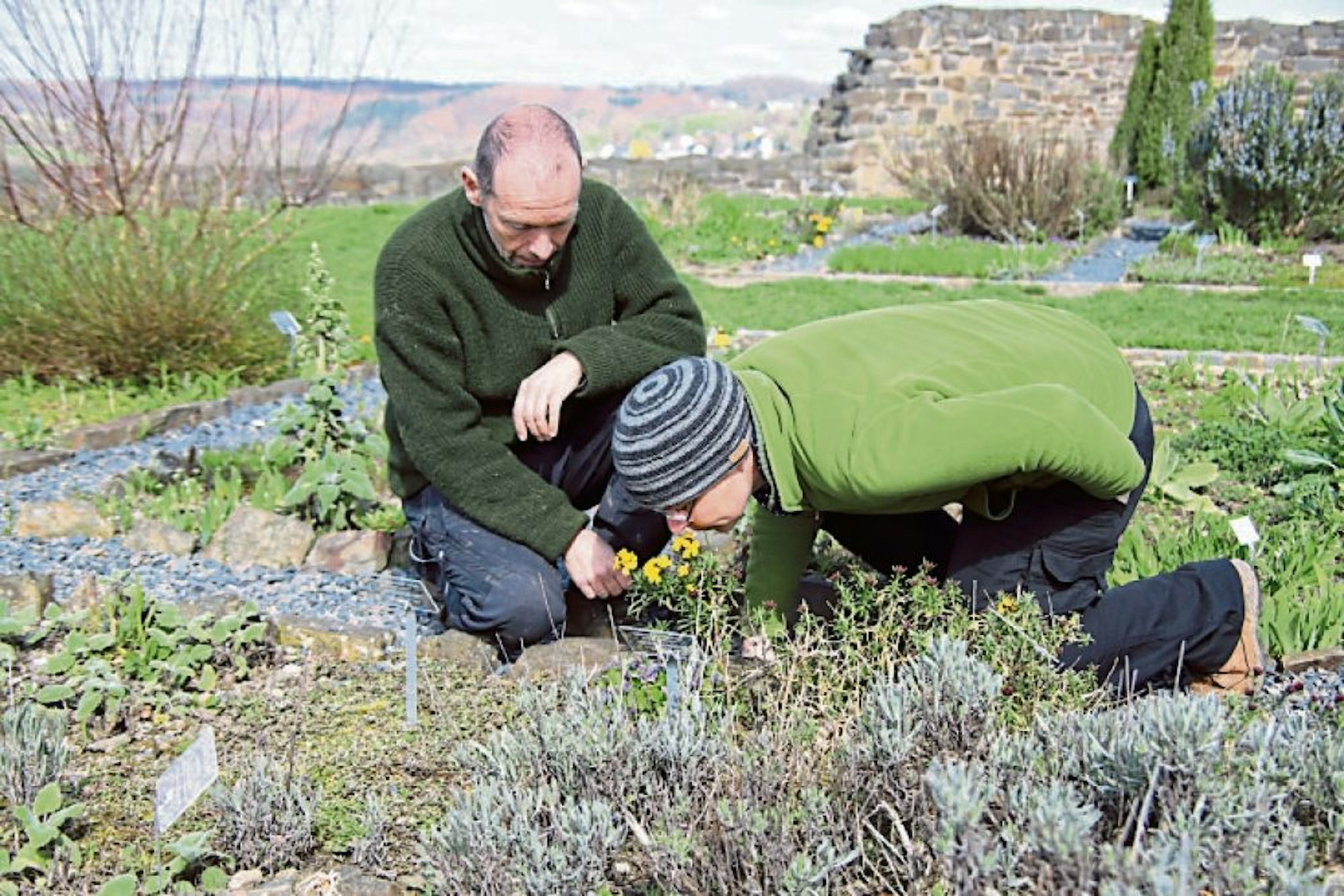 Hennef – Der Salbei-Gamander hat sich ausgebreitet, die Erdkastanie ist noch da, der Rosmarin-Strauch steht, mit der Wallfahrtskirche in Bödingen malerisch im Hintergrund, in voller Blüte und der stinkende Nieswurz reckt seine Kelche einer dicken Hummel entgegen. Es sind Namen wie aus den Harry-Potter-Büchern. Die Kulisse vermittelt einen Hauch von Mittelalter: Im Burggarten der Burg Blankenberg hält der Frühling mit Macht Einzug.