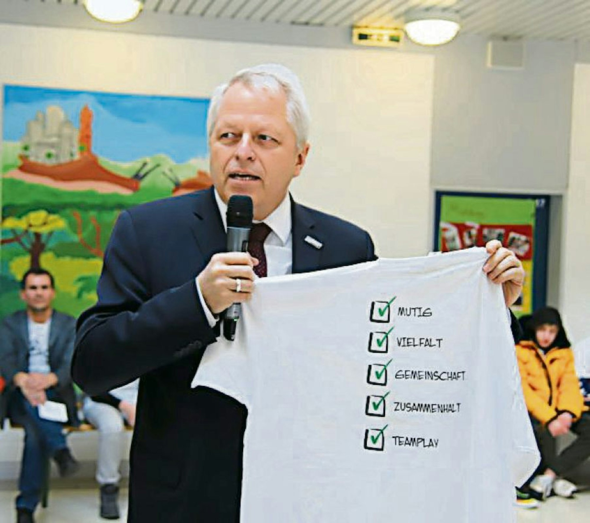 Als Pater spiritualis („Wat is dat denn?“ fragte er) wolle er Vater im Geist sein und unterstützen, gegen jede Form von Fremdenfeindlichkeit: „Ich verspreche, wiederzukommen und dabeizubleiben.“ Sprach’s und zog sich ein T-Shirt über, wie es die anderen schon trugen. Vorn das CJG-Logo, hinten die individuelle Gestaltung. Mathies hatte mutig Vielfalt, Gemeinschaft, Zusammenhalt und Teamplay auf den Rücken geschrieben, mit einem Haken in jedem Kästchen.