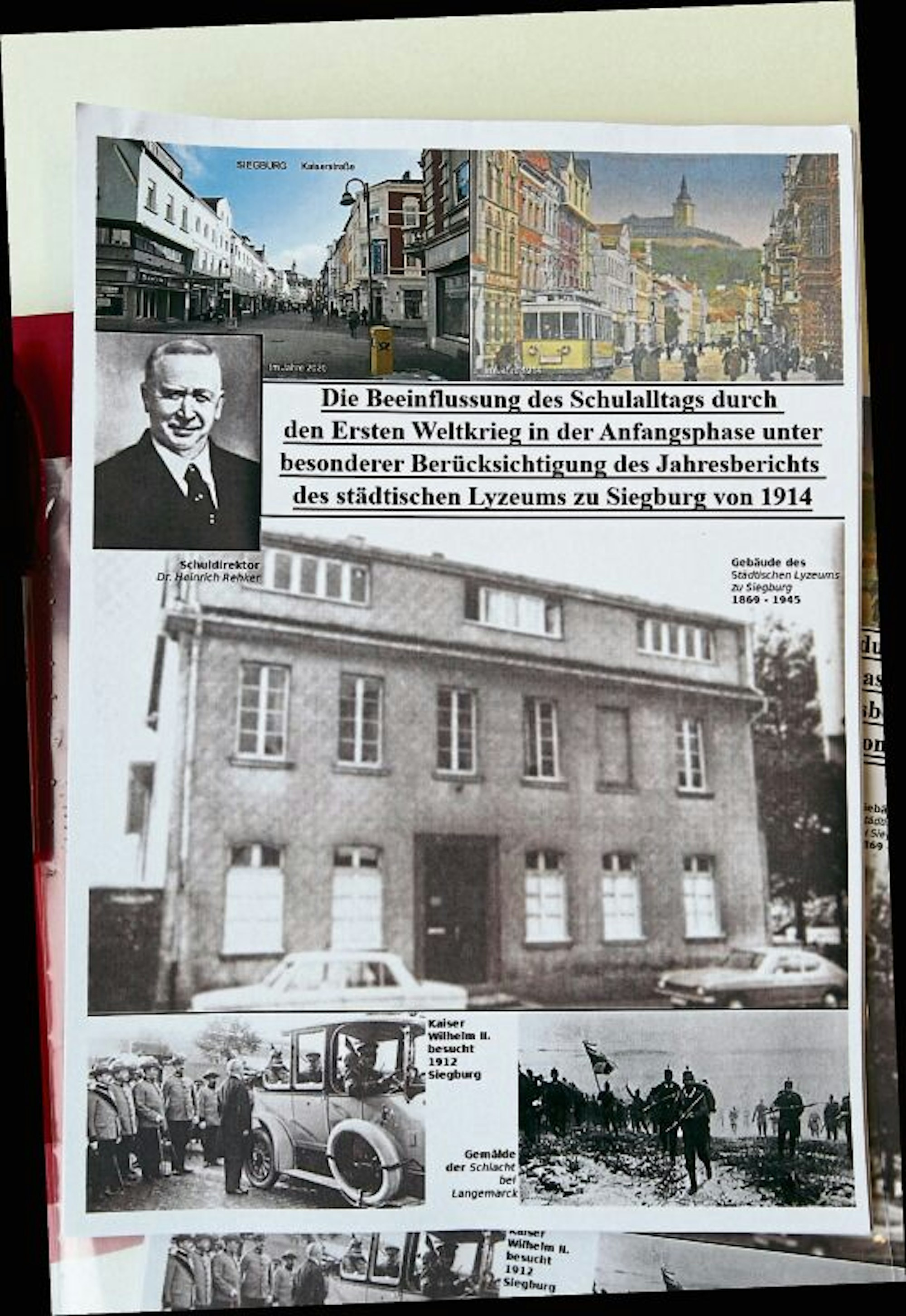 Mit dem Cover der Facharbeit gibt Autor Merlin Thierbach einen Eindruck von der Welt im Jahr 1915: Während der Erste Weltkrieg tobte, besuchte der Kaiser Siegburg. Lediglich das Foto vom Gebäude des Lyzeums ist erkennbar später entstanden.