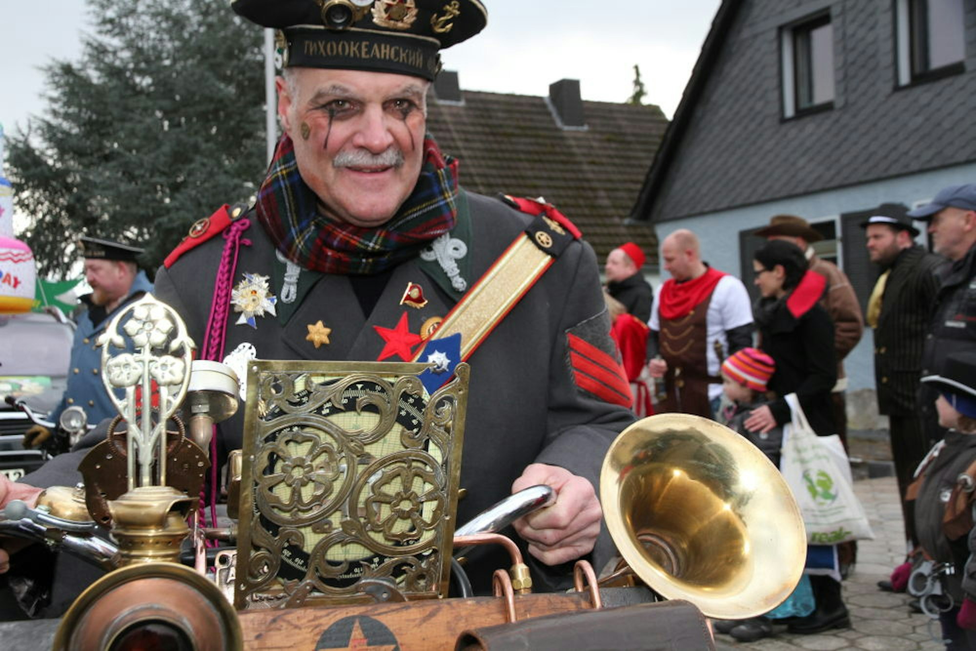 In seinem Steampunk-Kostüm nahm Gerald Kurz am Brückberger Veedelszug teil. Trotz der Uniform sehen sich Steampunks ausdrücklich als Pazifisten.