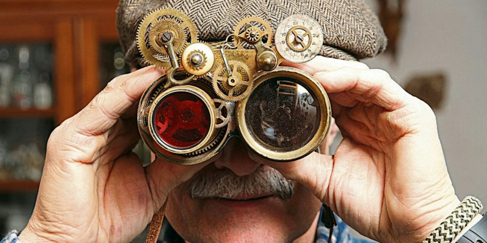 Goggles, abenteuerlich verzierte Schutzbrillen, sind ein besonders wichtiges Utensil und eine Art Erkennungszeichen der „Steampunks“. Kurz baut sie beispielsweise aus alten Messingferngläsern, die er mit farbigen Filtergläsern und Zahnrädern zu skurrilen Instrumenten macht. In der Szene werden solcher Technik unglaubliche Eigenschaften zugeschrieben: Der „Eindrückler“ macht viele Kilometer Entferntes hörbar, der „Peacemaker“ kann heilsame Strahlen verschießen. Mit dem „Zeitreisestab“ lässt sich gar in die Zukunft blicken.